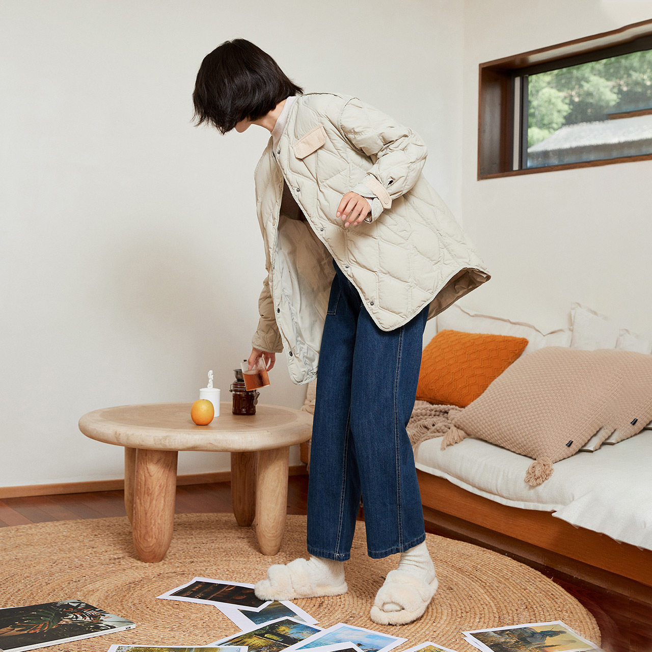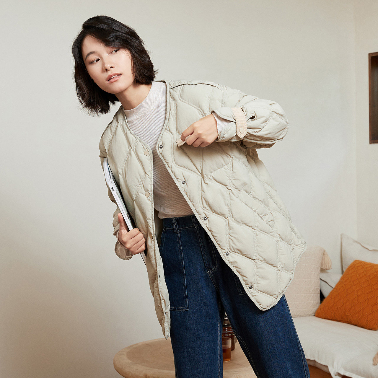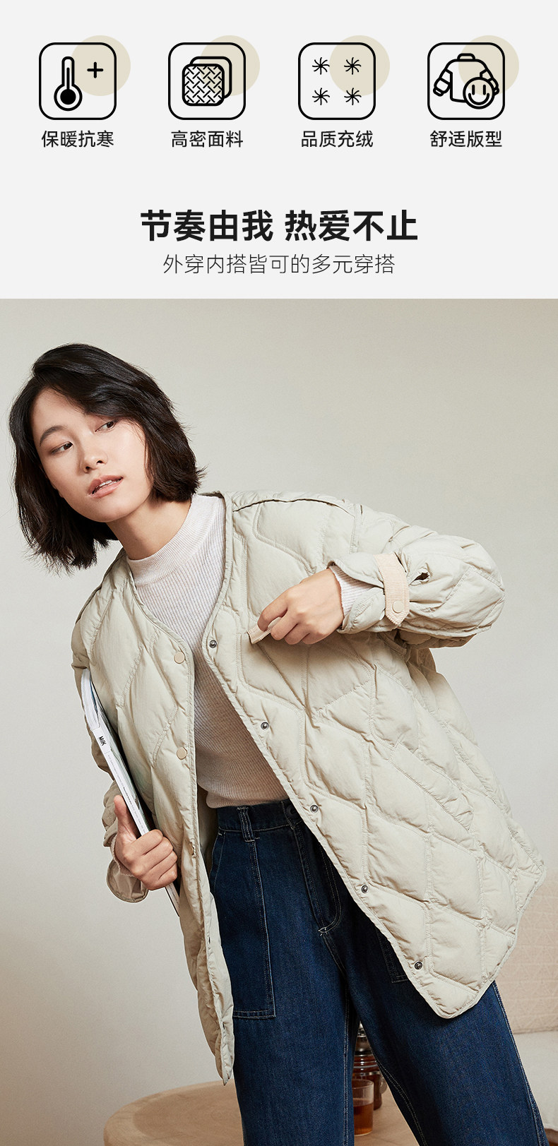 Демисезонный легкий и тонкий комфортный пуховик с круглым воротником