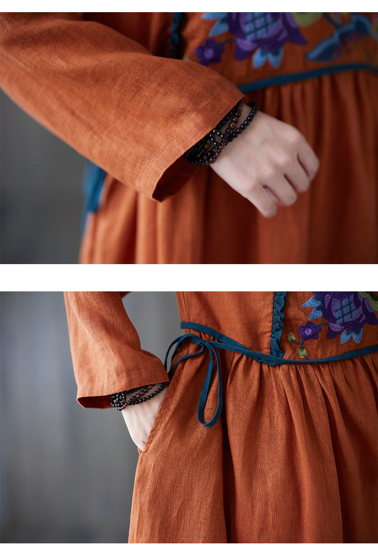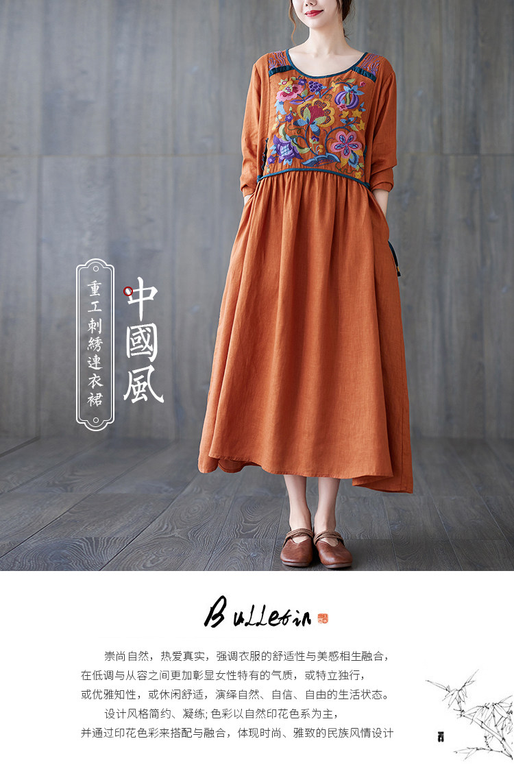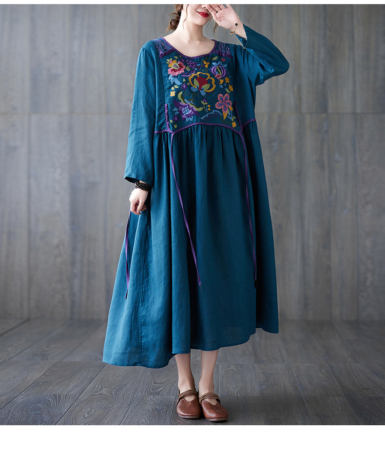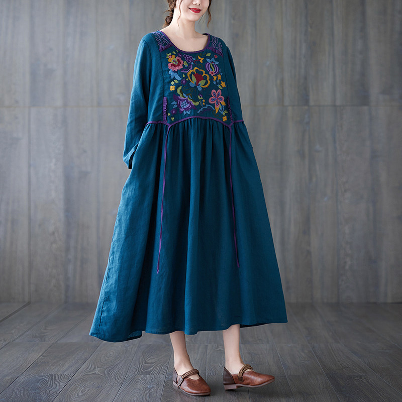 Этнический осенний лонгслив, осеннее платье, ретро длинная юбка, этнический стиль, с вышивкой, из хлопка и льна, коллекция 2023, длина макси