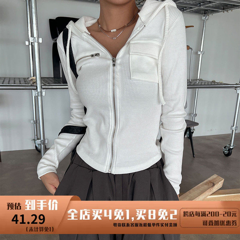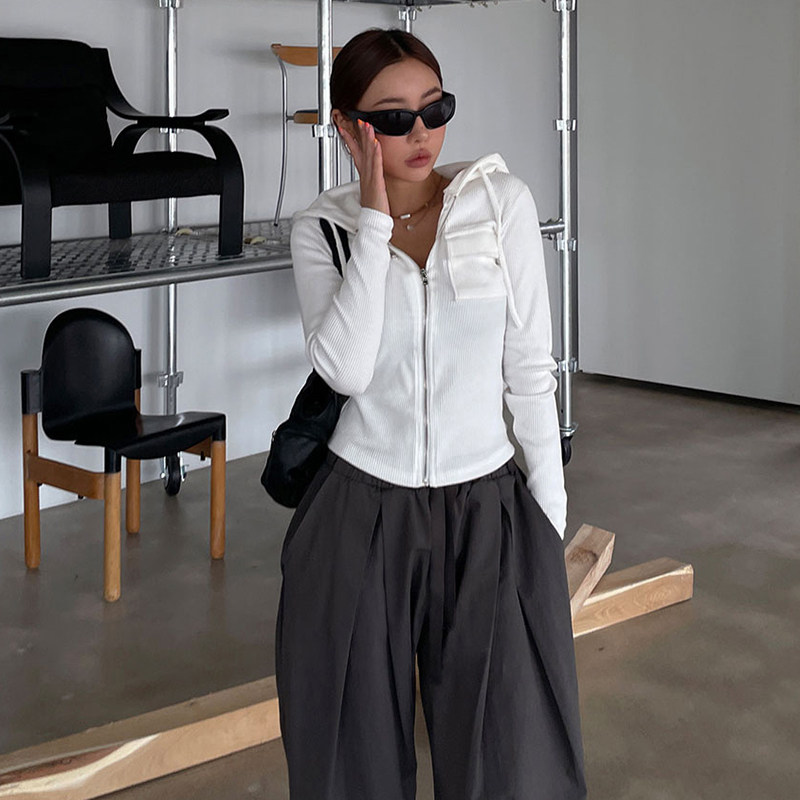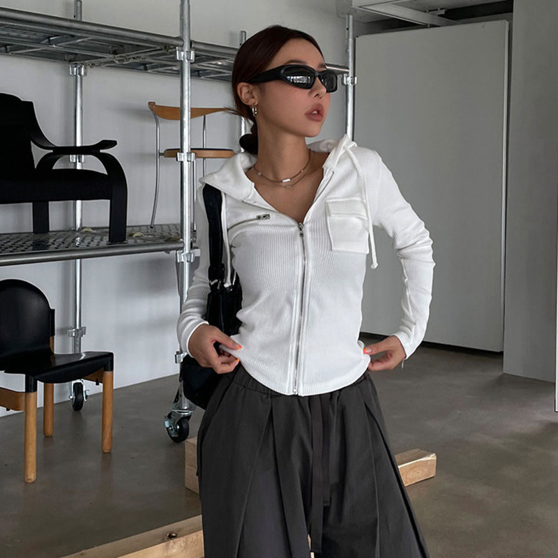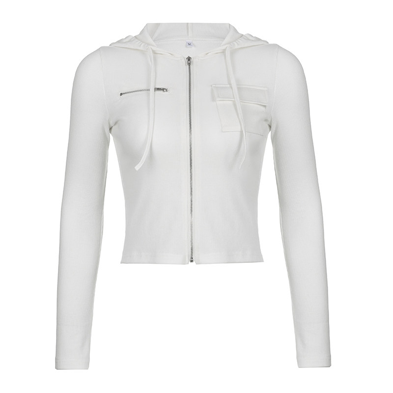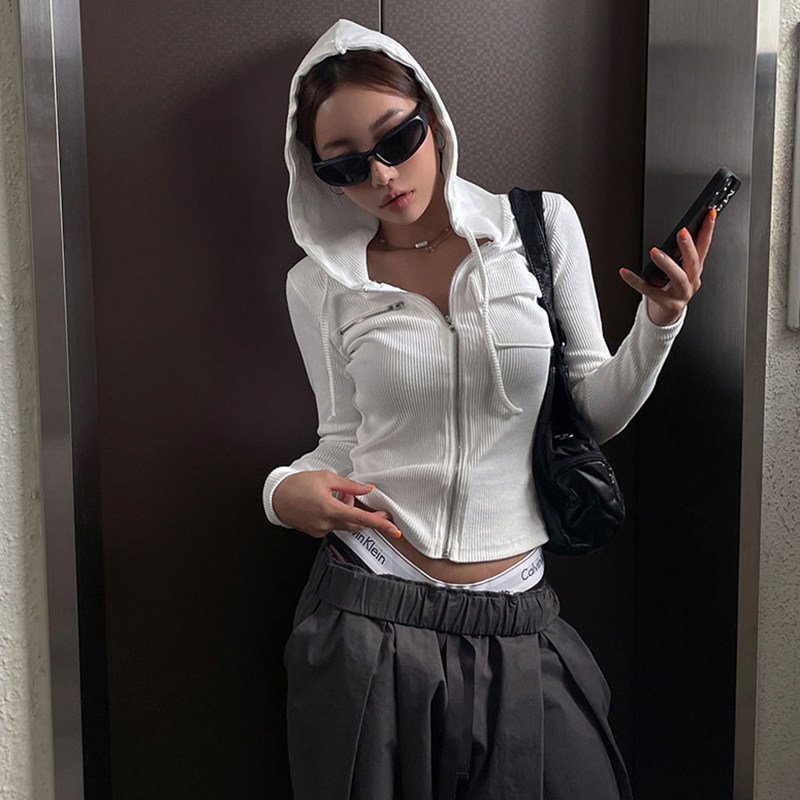 WEEKEEP Ретро повседневный стиль, однотонная куртка с карманами на молнии и длинными рукавами, уличный универсальный короткий топ с капюшоном