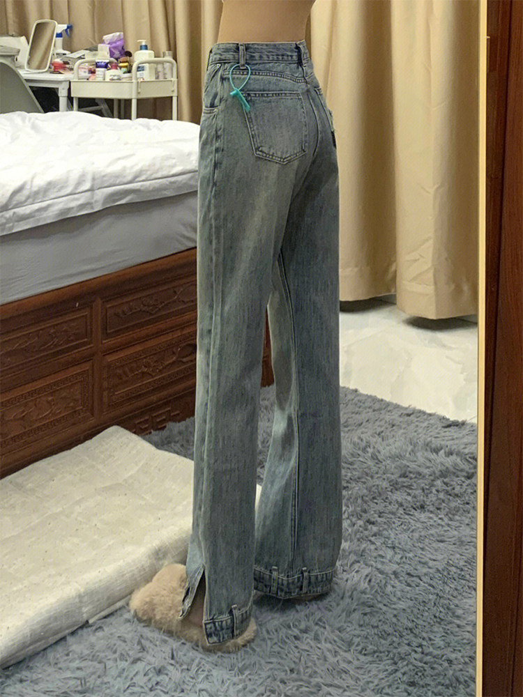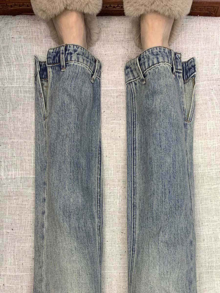 Ретро синие джинсовые демисезонные джинсы, штаны, приталенные леггинсы, мегафон, в американском стиле, высокая талия, свободный прямой крой