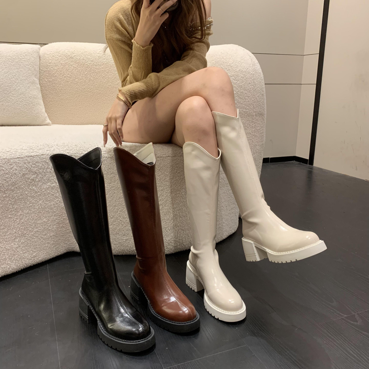 Коричневые белые демисезонные высокие сапоги на высоком каблуке, ботинки, коллекция 2022, подходит для подростков, осенние