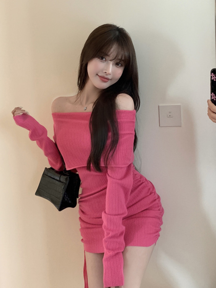 Розовые румяна, трикотажное демисезонное сексуальное трикотажное платье, изысканный стиль, с акцентом на бедрах, открытые плечи