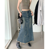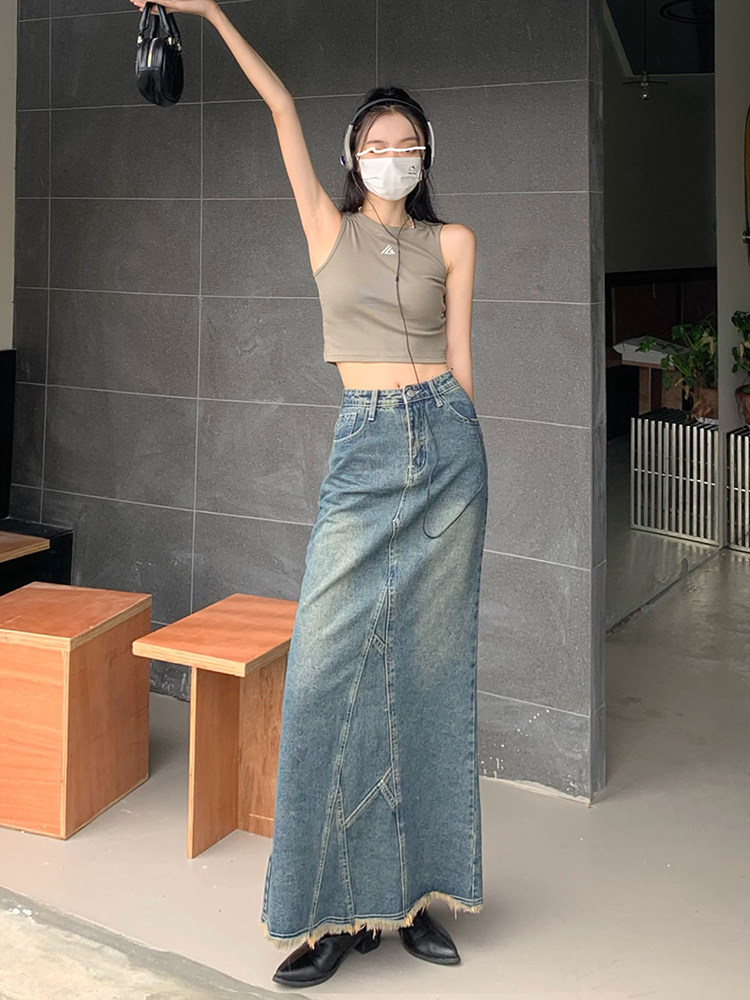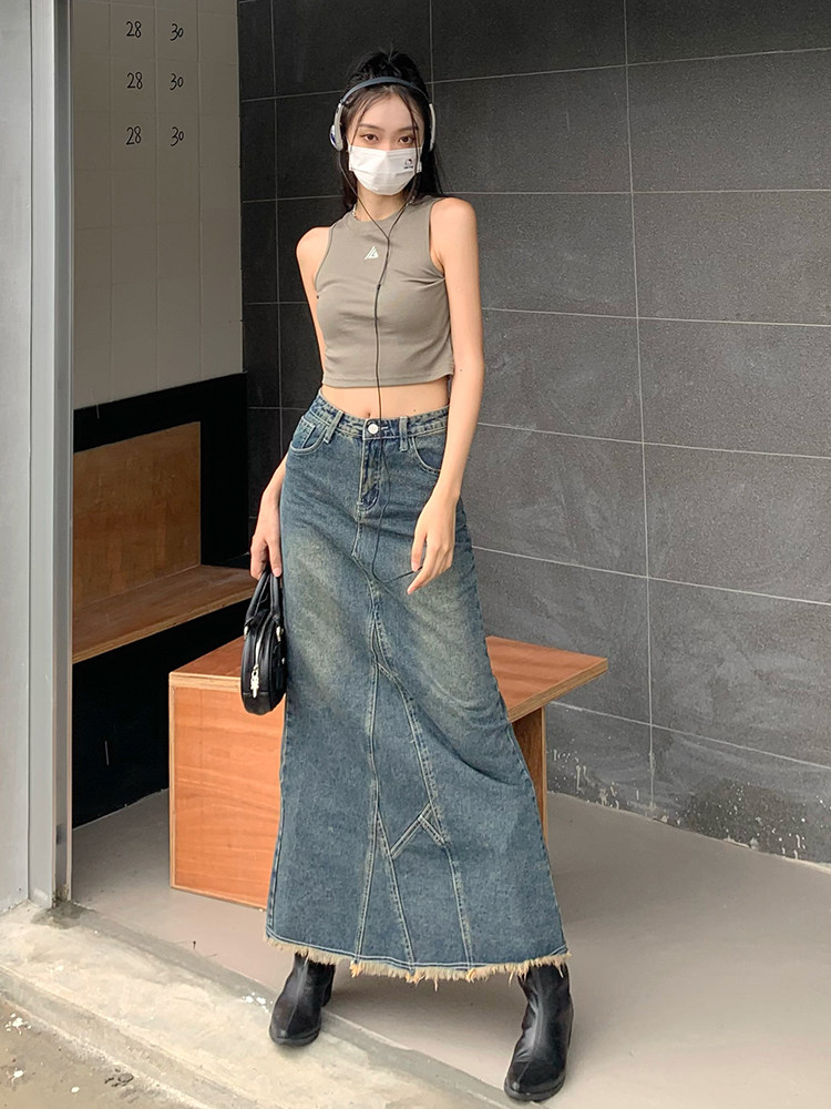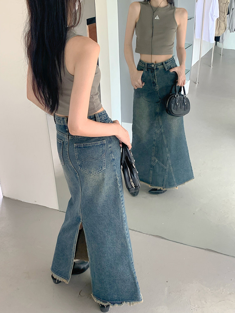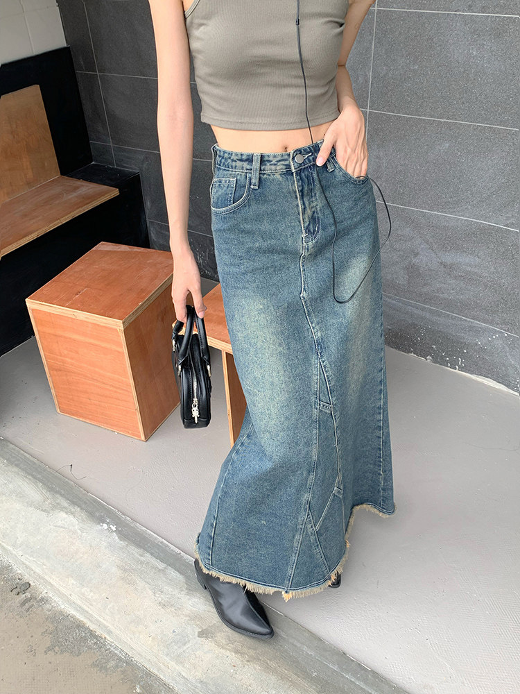 Ретро длинная юбка, джинсовая юбка, рыбий хвост, с акцентом на бедрах, высокая талия