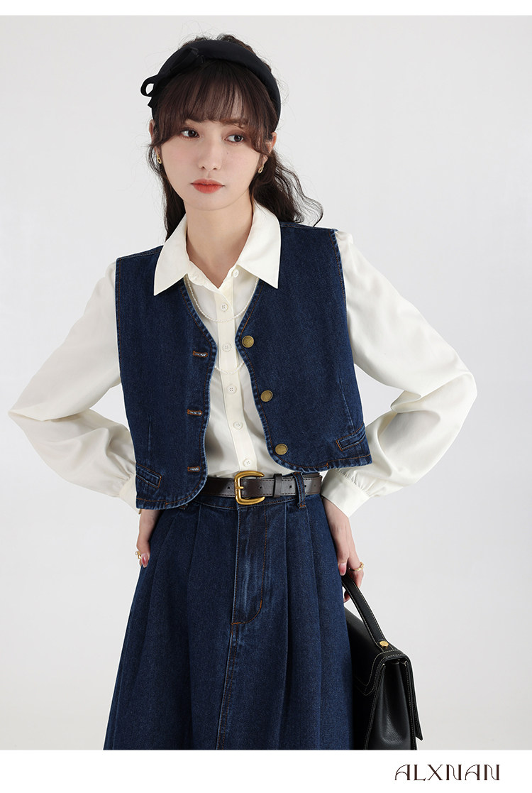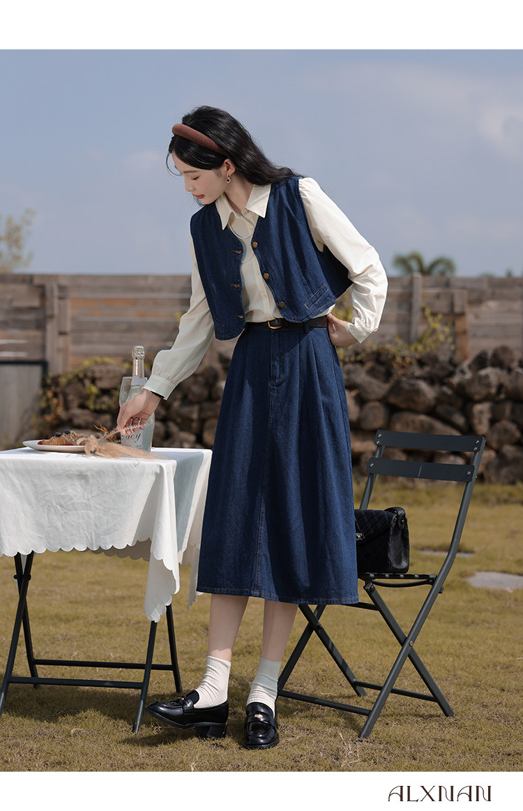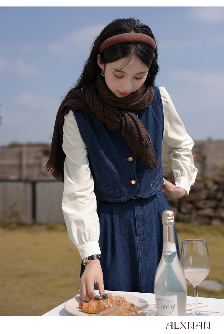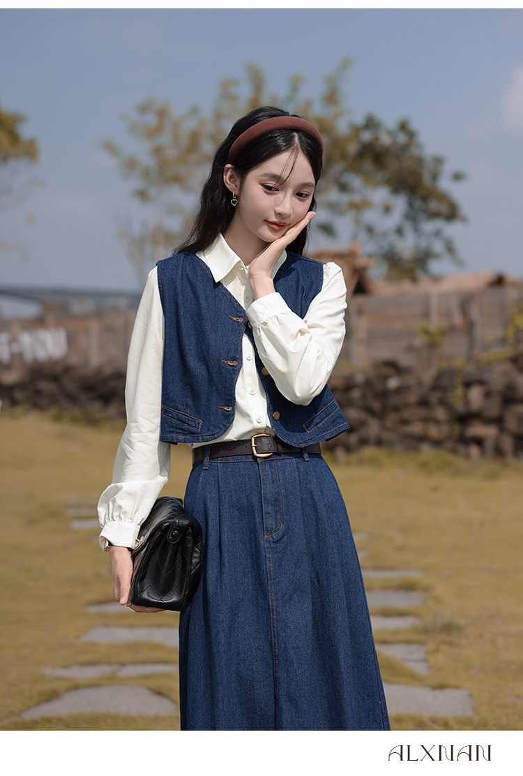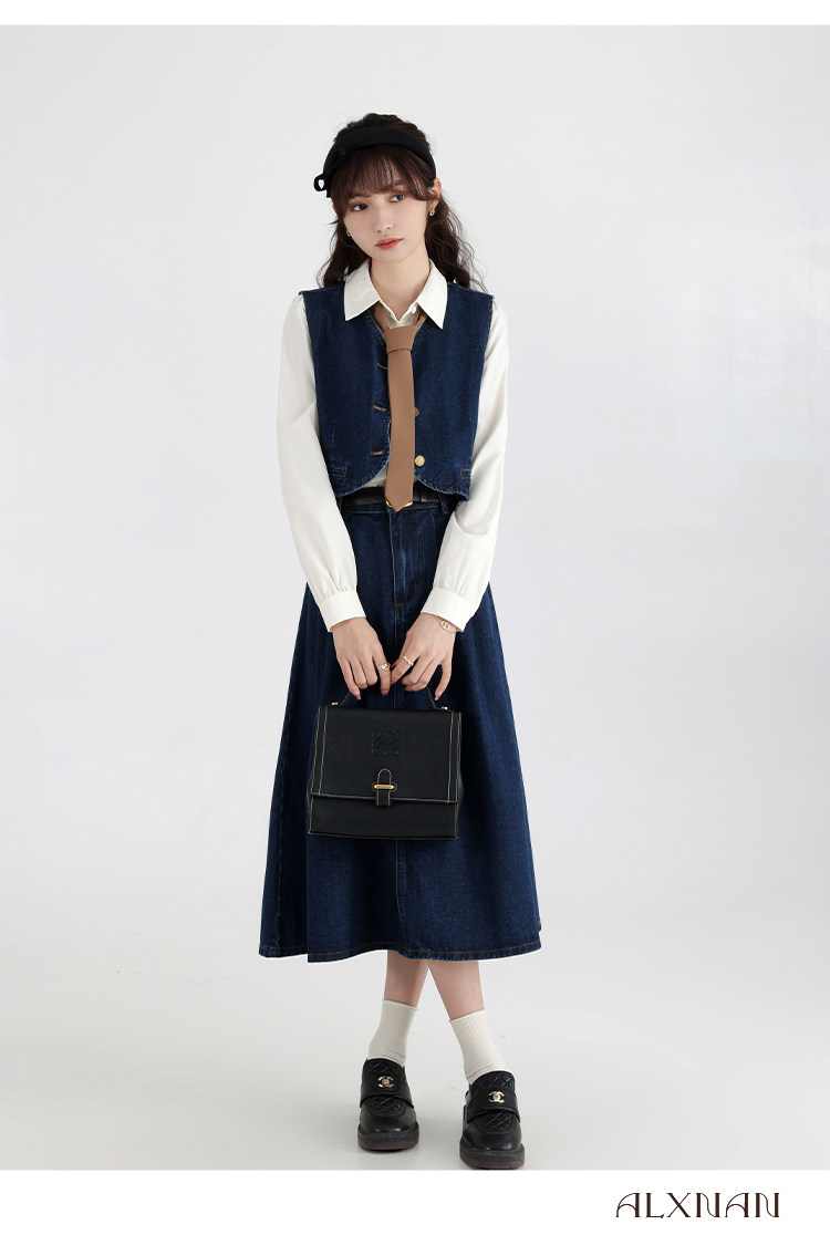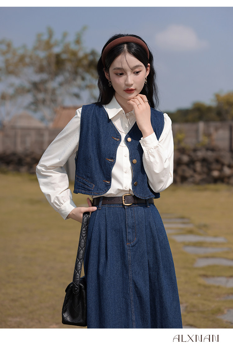 鹿向南 Ретро джинсовый жилет, осенняя рубашка, юбка, комплект, 3 предмета