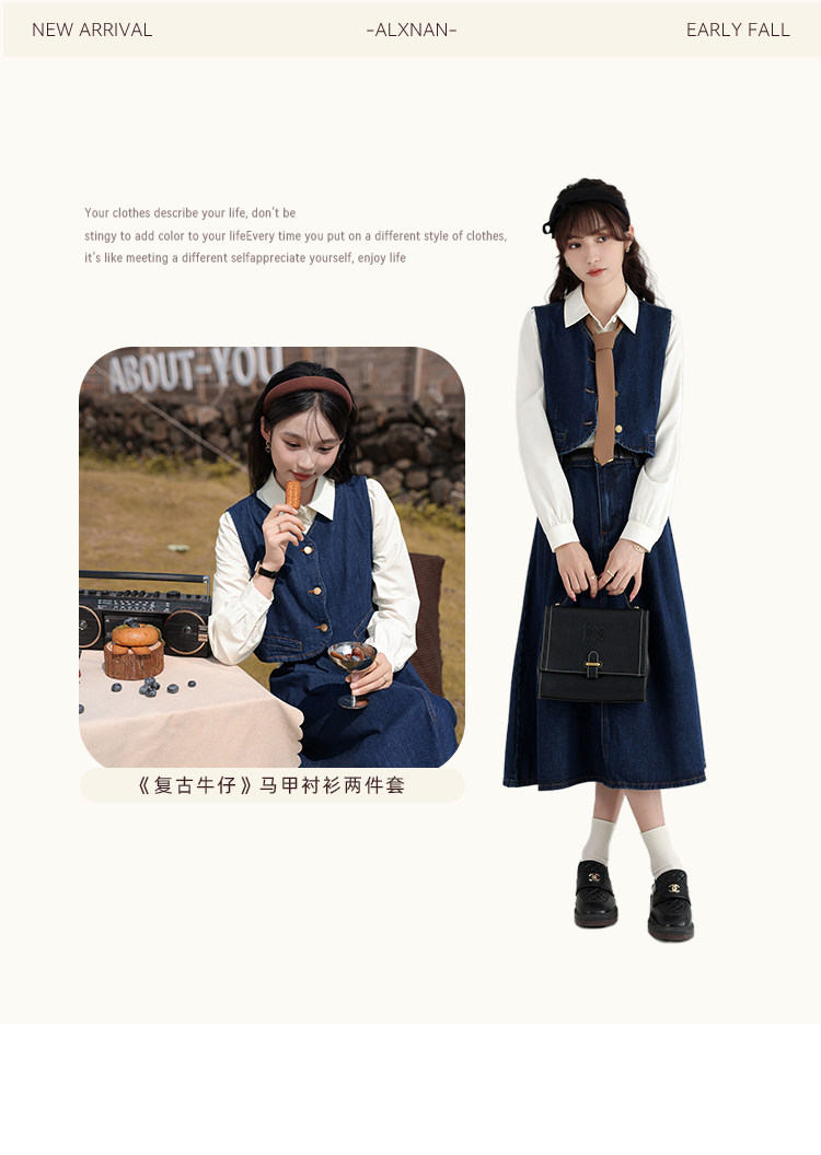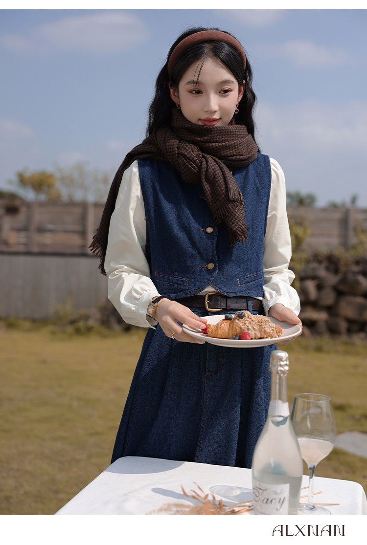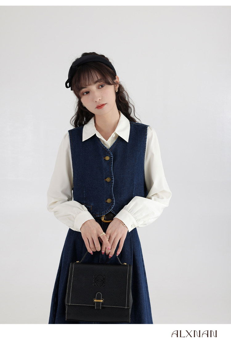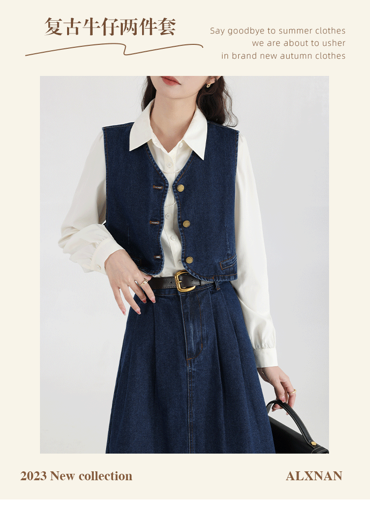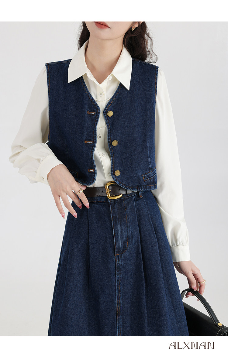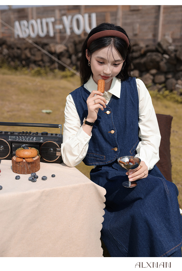 鹿向南 Ретро джинсовый жилет, осенняя рубашка, юбка, комплект, 3 предмета