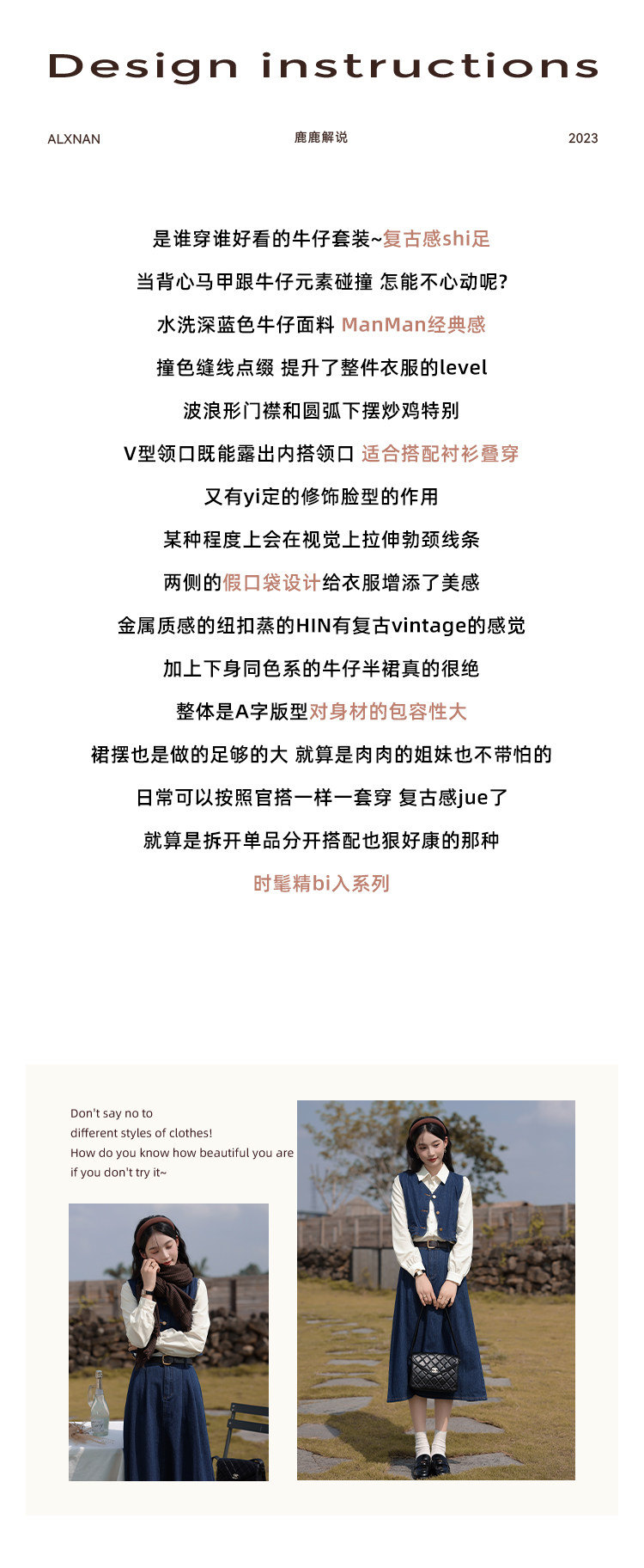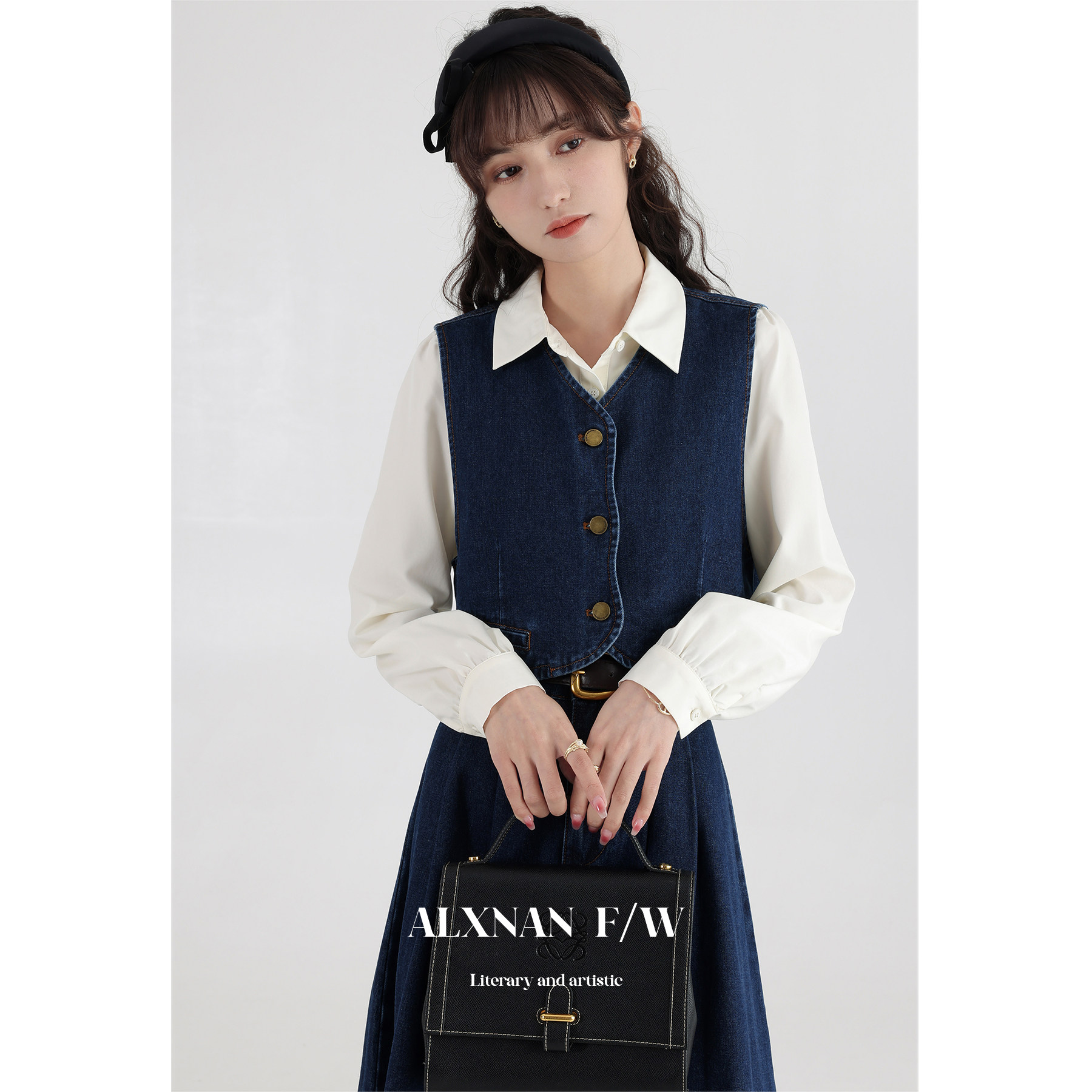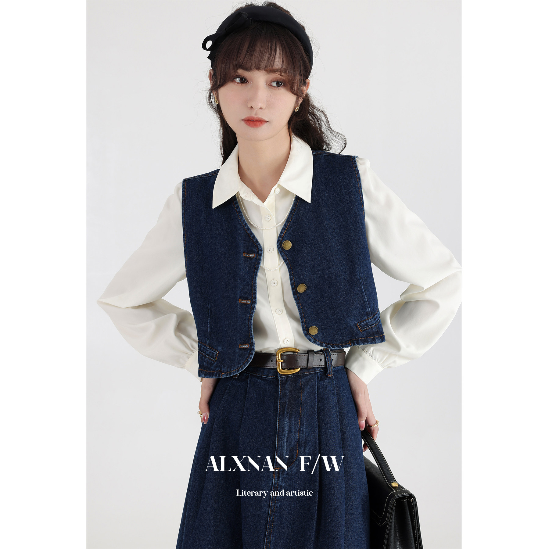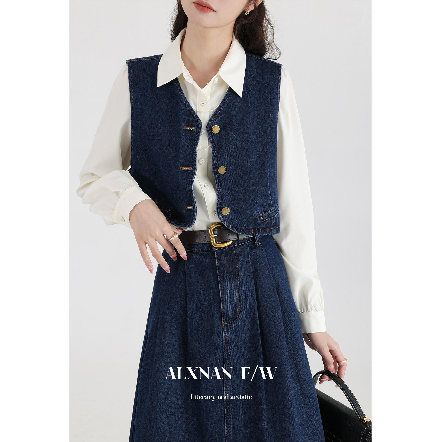 鹿向南 Ретро джинсовый жилет, осенняя рубашка, юбка, комплект, 3 предмета