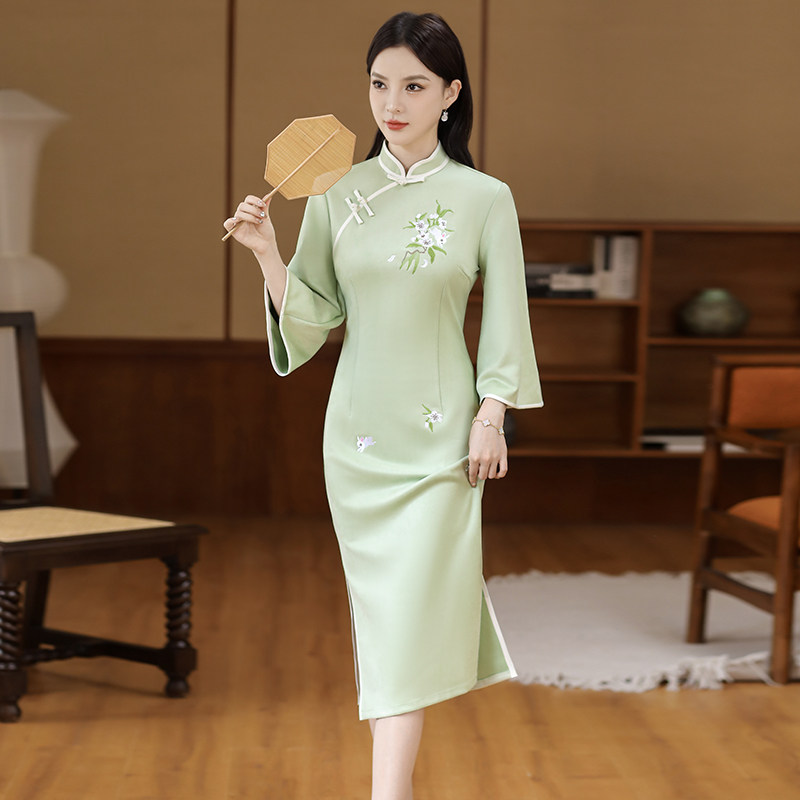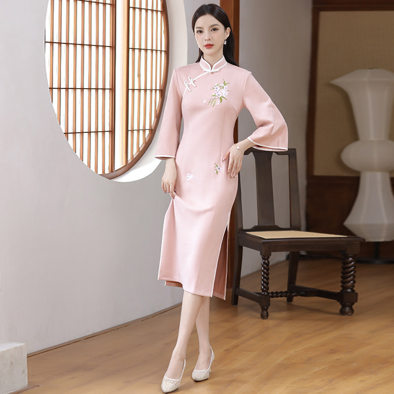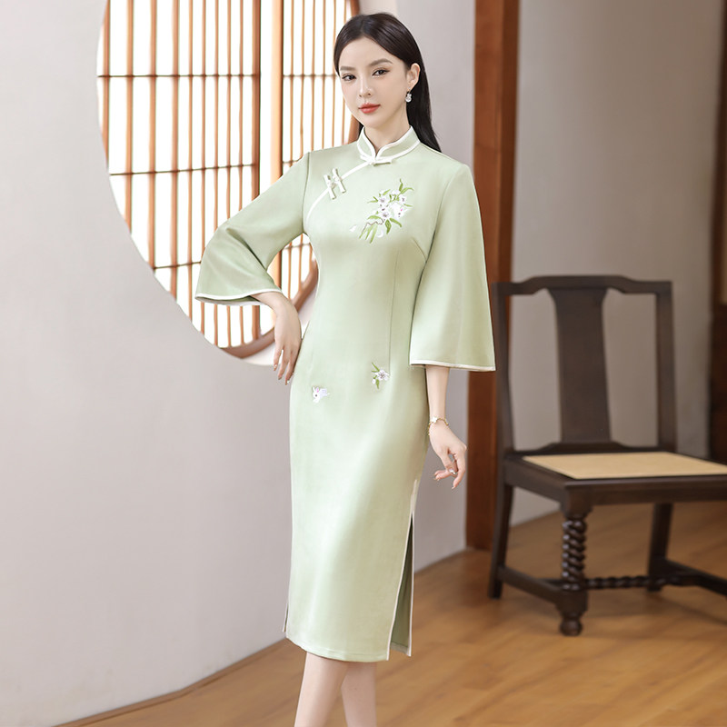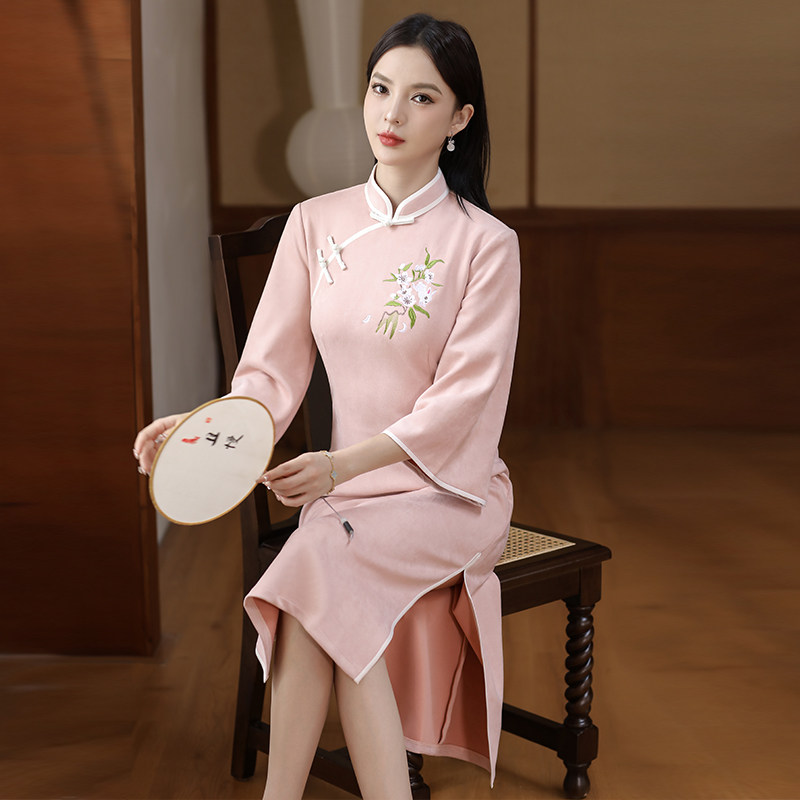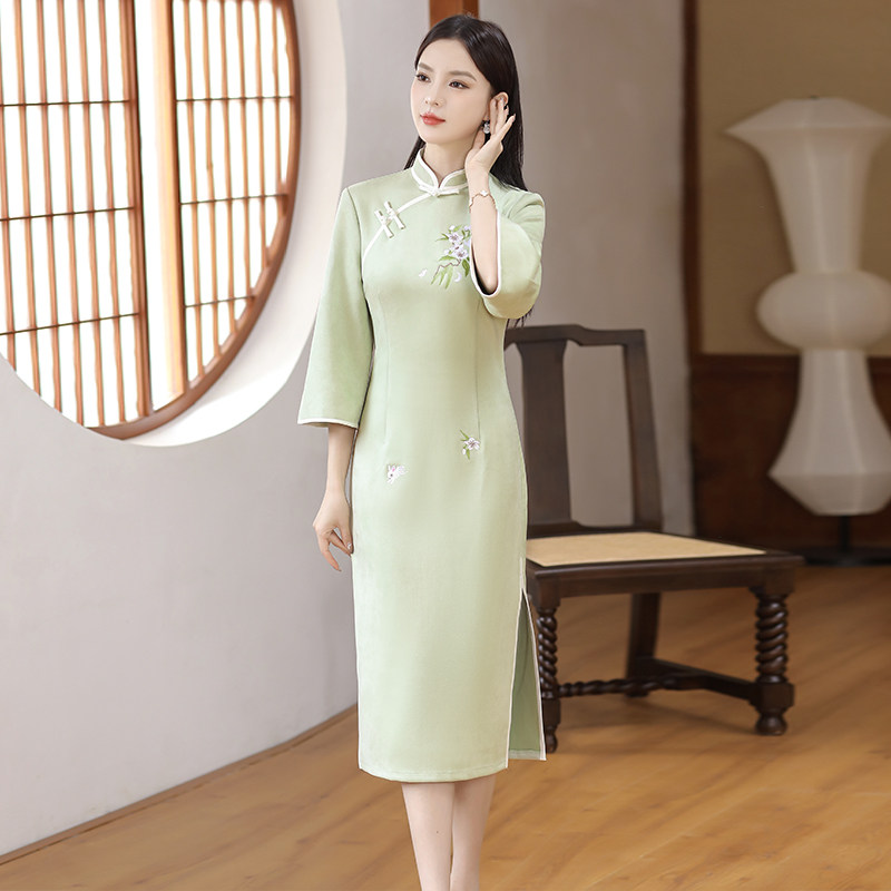 Легкое бархатное демисезонное элитное ципао, платье, с вышивкой
