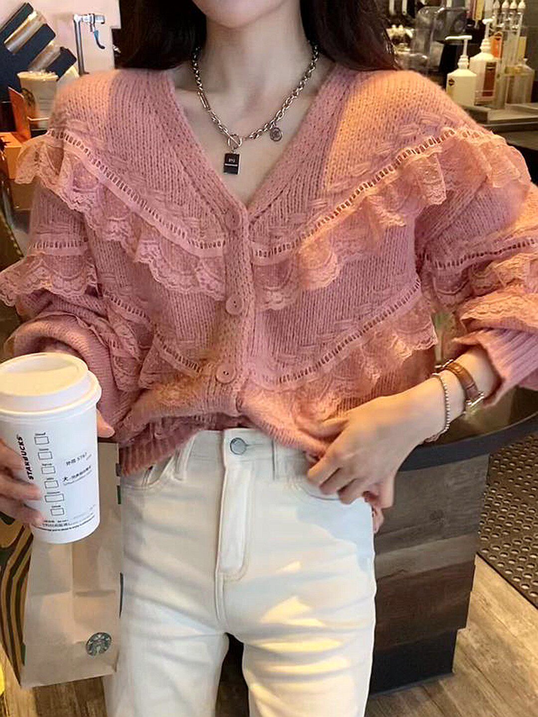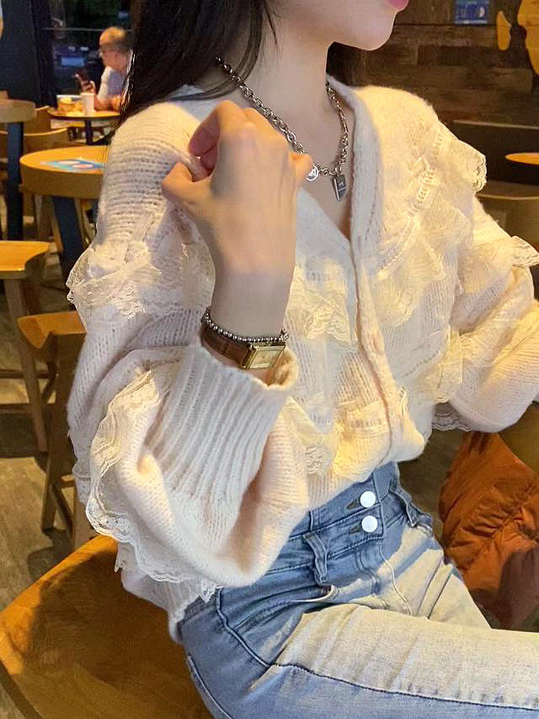 Трикотажный осенний кружевной милый свитер, в стиле кэжуал, свободный крой, кружевное платье, V-образный вырез