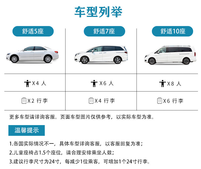| Модель автомобиля: | 7 роскошь 7 (6 человек, 4 штуки из 24 -дюймового багажа), Комфортные 7 мест (5 человек и 3 места 24-дюймового багажа), Пять мест (3 человека, 2 штуки 24 -дюймового багажа) |