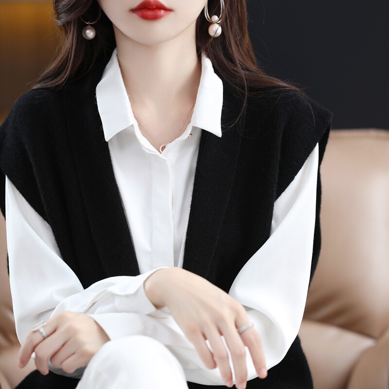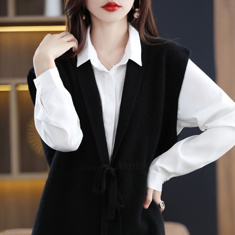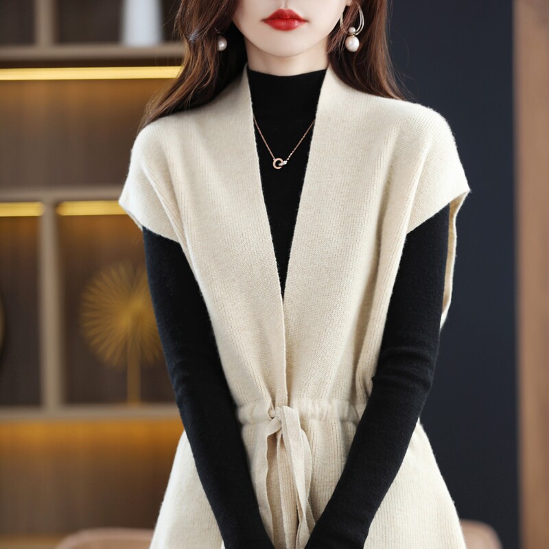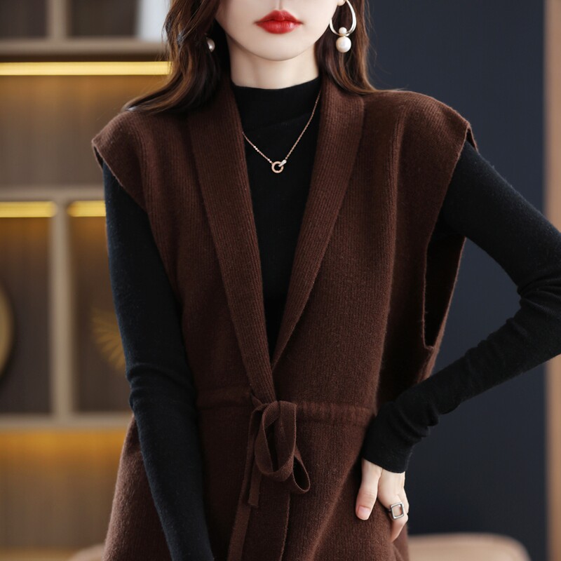 Шерстяной жилет, длинный трикотажный демисезонный свитер, V-образный вырез, оверсайз