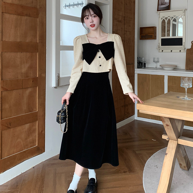 Небольшая юбка с бантиком, комплект, большой размер, французский стиль, в стиле Шанель, квадратный вырез, высокая талия