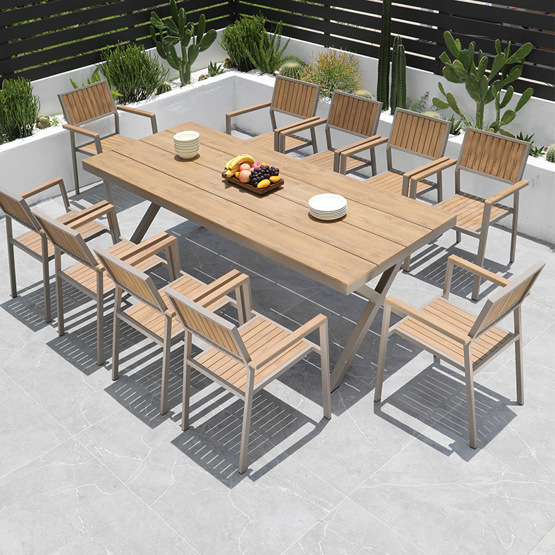 Наружные пластиковые деревянные столы и кресло во дворе водонепроницаемые солнцезащитные кремовые кремовые кремовые