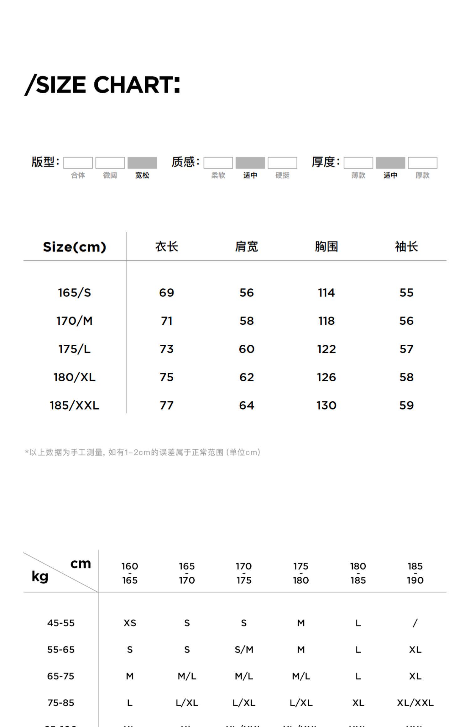 - = 185/XXL 175/L 180/XL