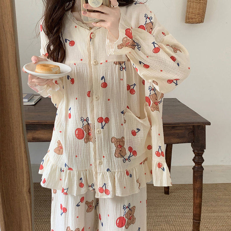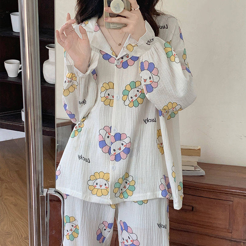 Брендовая хлопковая марлевая осенняя пижама, лонгслив, штаны, кардиган, осенний демисезонный комплект, в корейском стиле