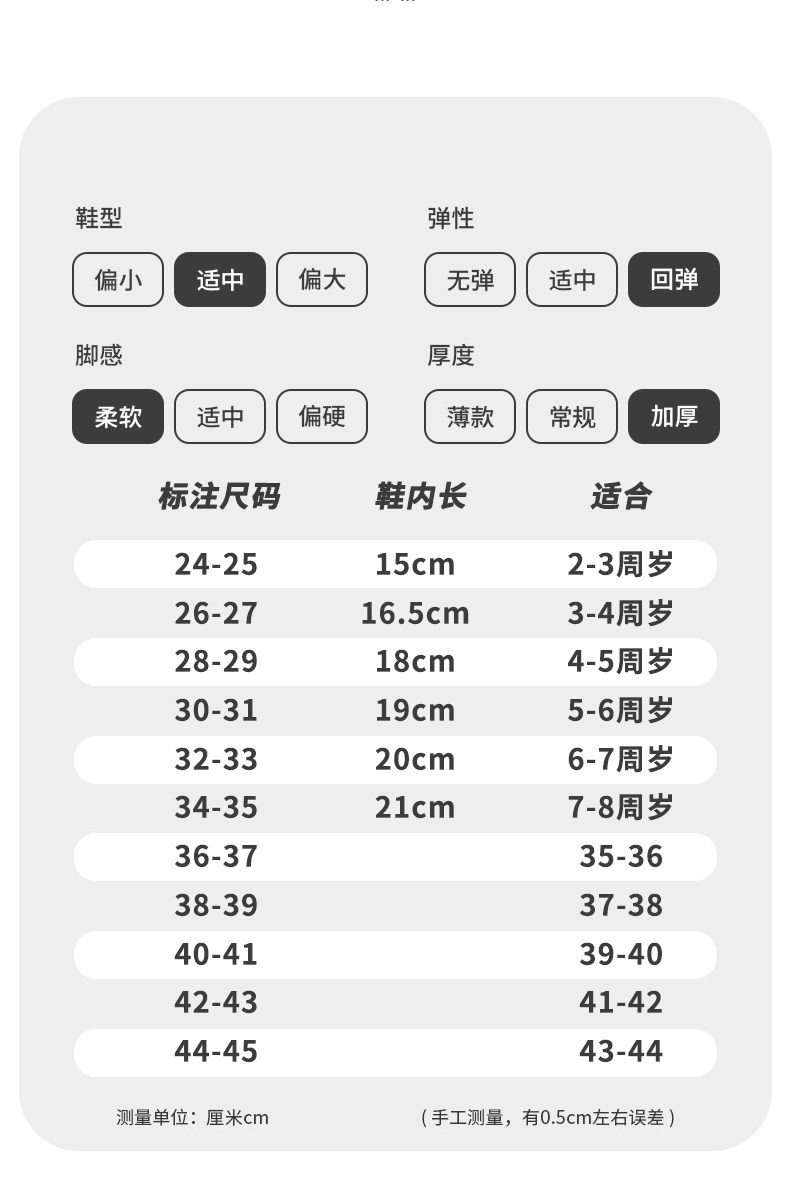 | Размер обуви: | 24/25 код длиной 15 см подходит для длины футов 14.cm, Размер 26/27, внутренняя длина 16,5 см, подходит на ногу длиной 15,5 см., 28/29 код длиной 18 см подходит для длины 17 см., 30/31 код 19 см в длину подходит для длины футов 18 см., 32/33 Код длиной 20 см подходит для длины 19 см футов, 34/35 код длиной 21 см и подходит для 20 см в длину, 36/37 [Подходит для 35-36 футов], 38/39 [Подходит для 37-38 футов], 40/41 [подходит для 39-40 футов], 42/43 [подходит для 41-42 футов для износа], 44/45 [подходит для 43-44 футов] |