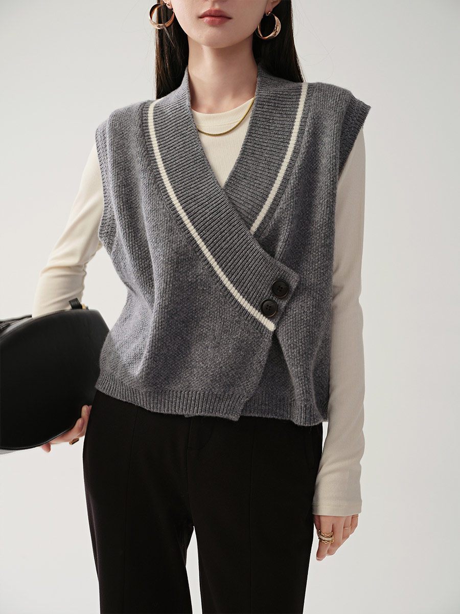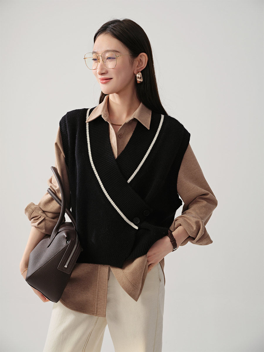 Тыквенная долина, сложенная через жилет | 100.%полная шерсть^одноразовая игла | Контрастная воротника вязаная жилет B0204