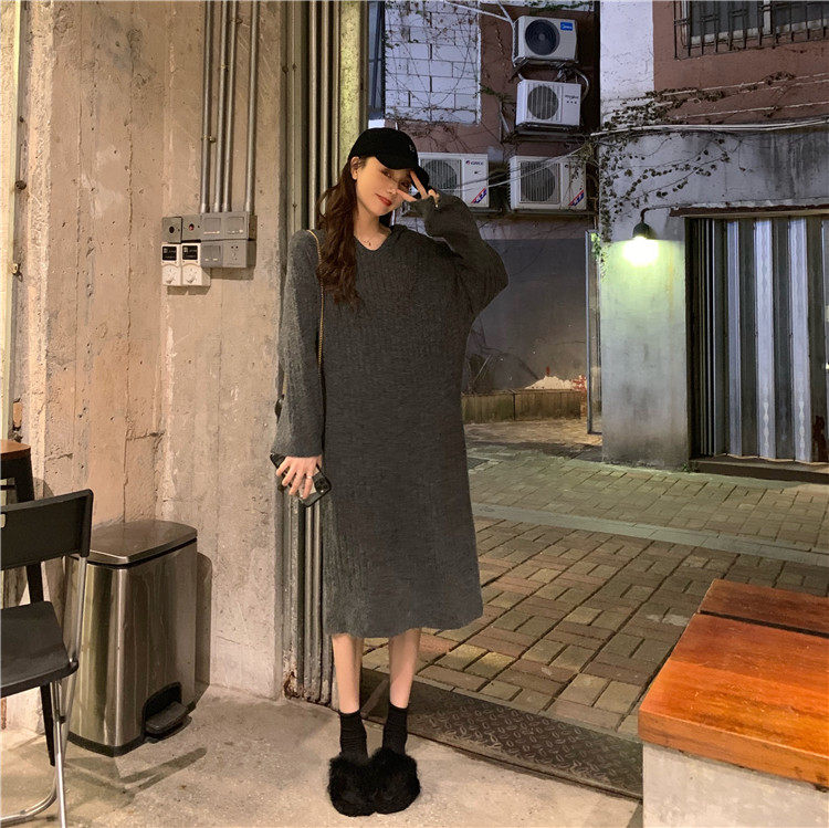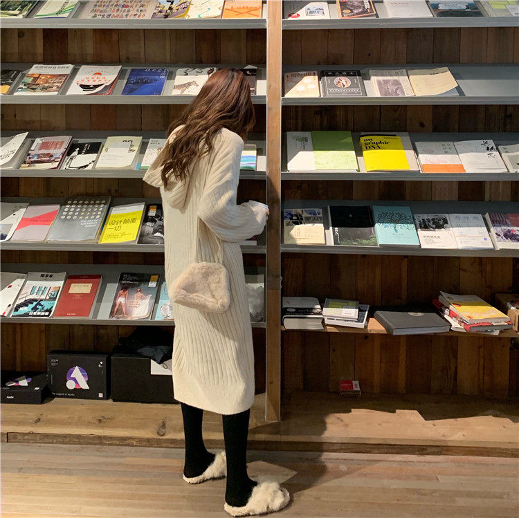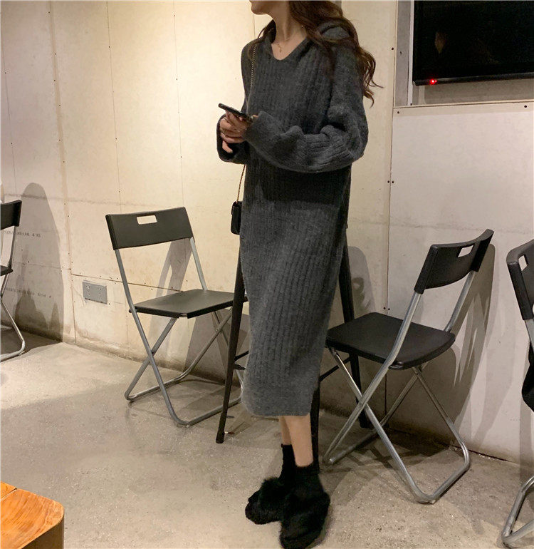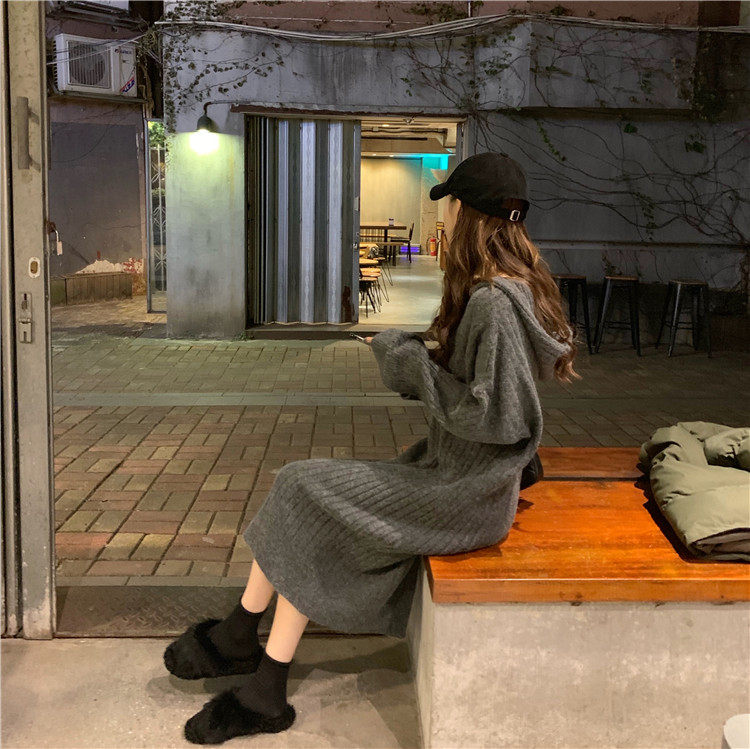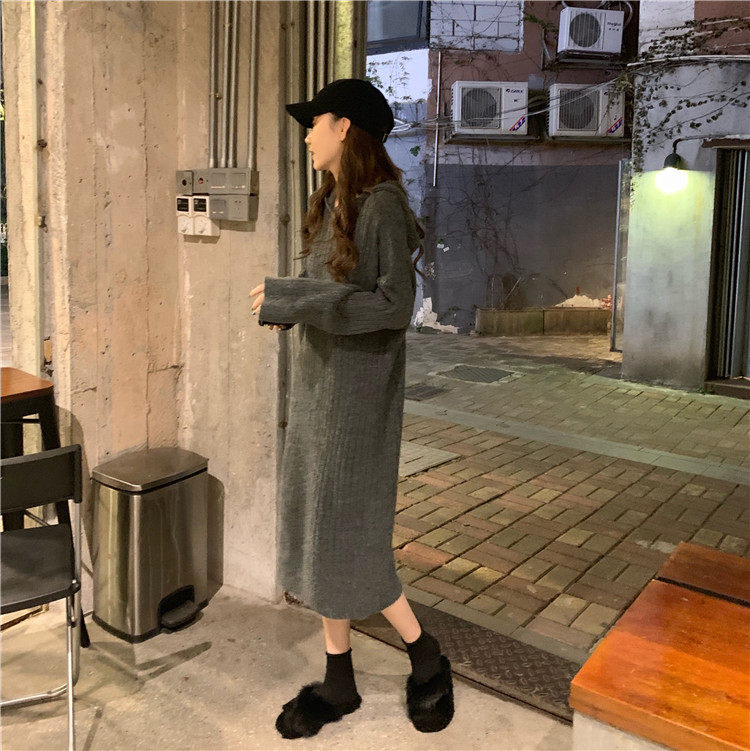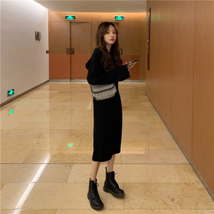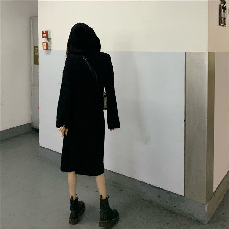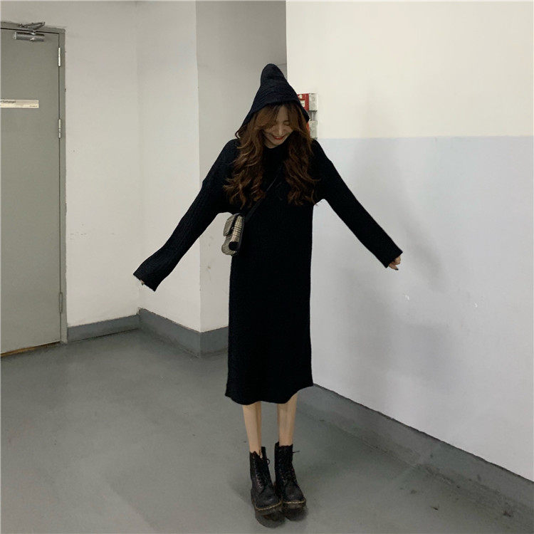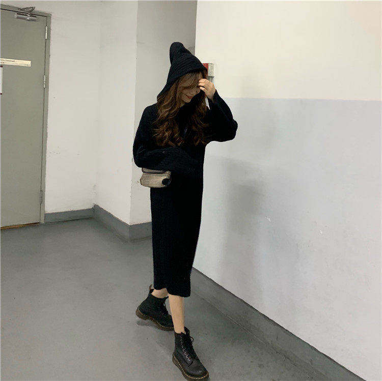 Длинное демисезонное шерстяное платье, трикотажная толстовка с капюшоном, средней длины, увеличенная толщина