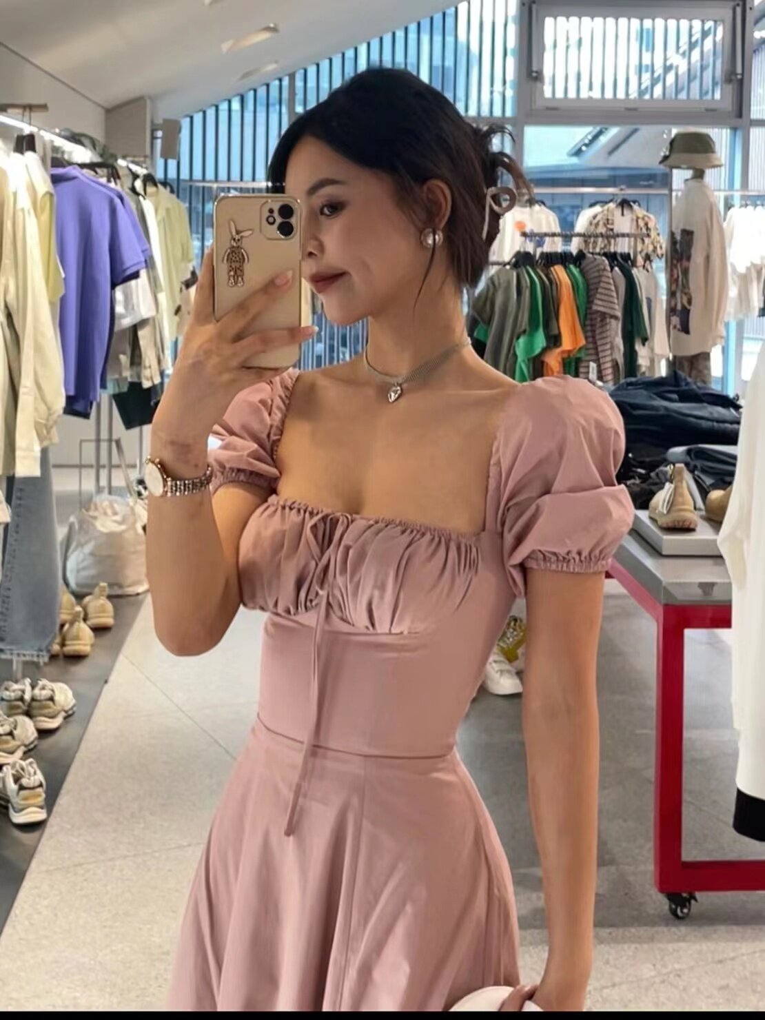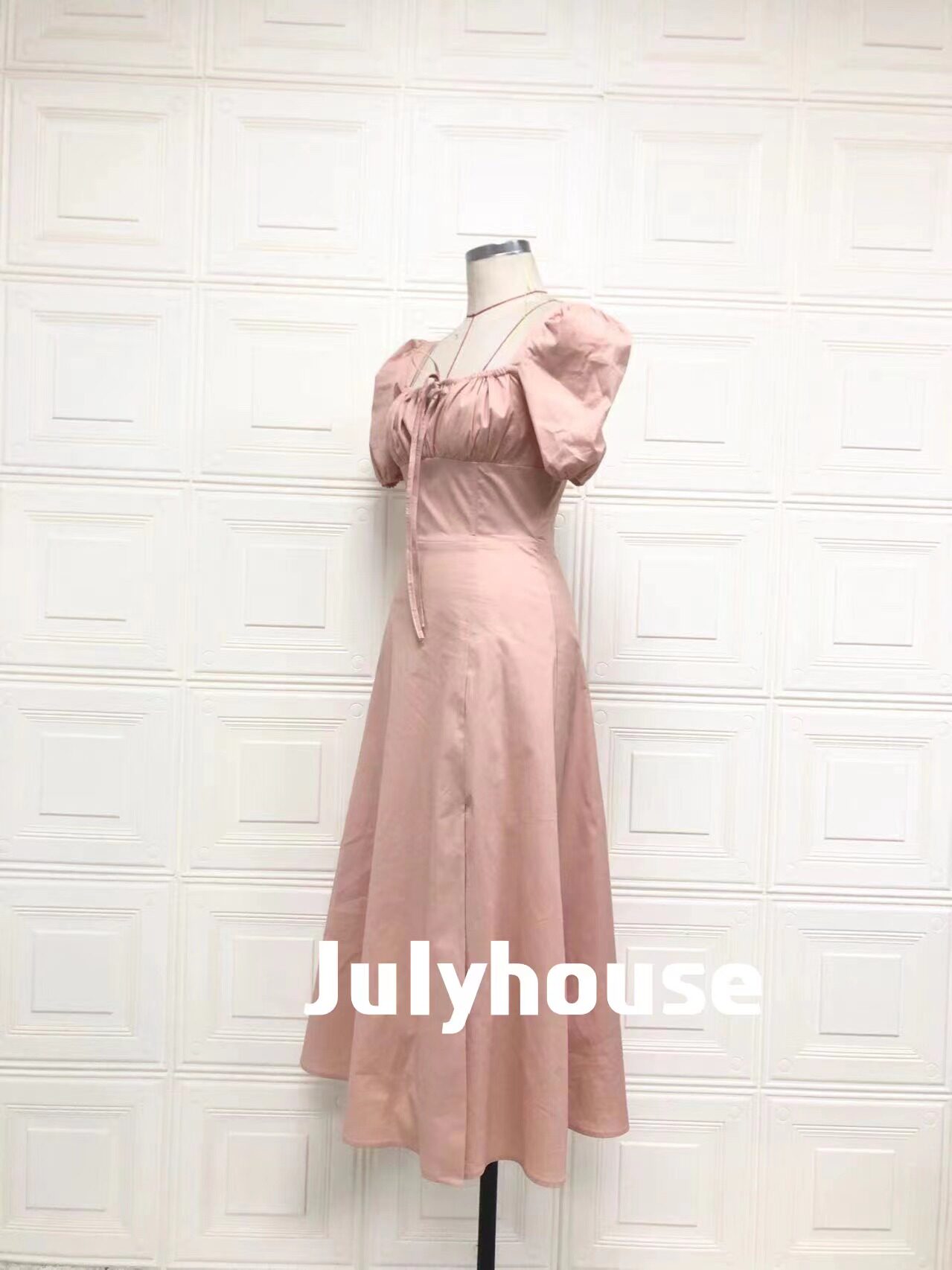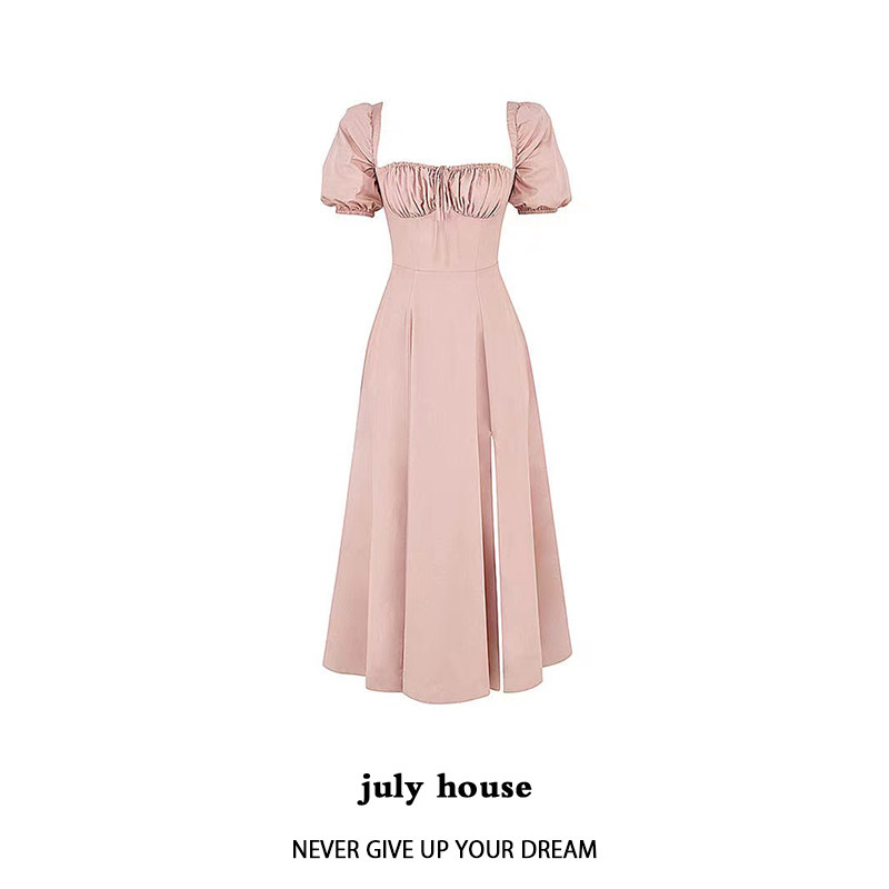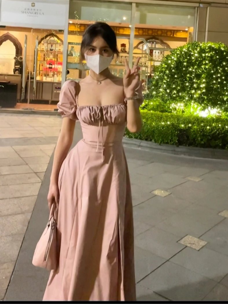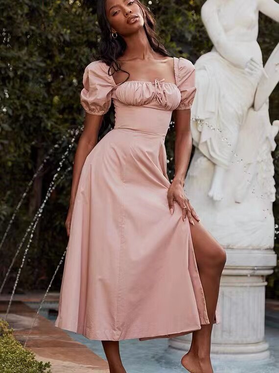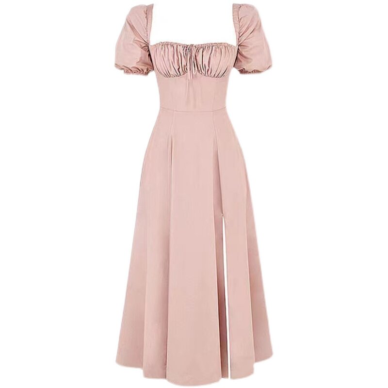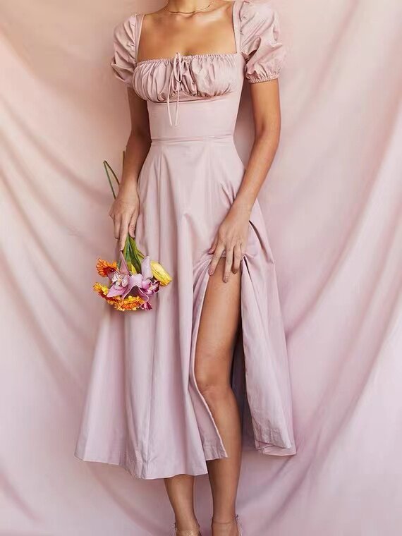 Однотонное платье, розовый корсет, длинная юбка, квадратный вырез, рукава фонарики