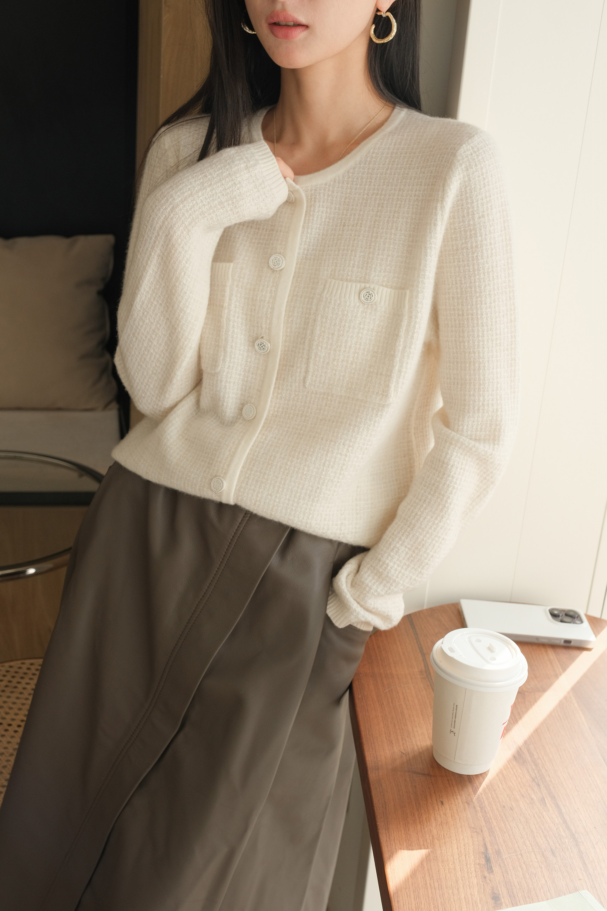 | [頂级的用料与工艺][,低调奢華、崇尚自然的调性] [由手工艺人反复精心打磨所得到的][羊绒原料] [采用][獨家针法][,][经纬交错编织][,工艺复杂] [夹杂金银丝][高密织造凸显其蓬松立体又菁致的编织肌理] [内外手工缝制,利落流畅,一针一线皆为匠心] [重磅定制扣加持][,提升整体品质,点睛之笔] | ||