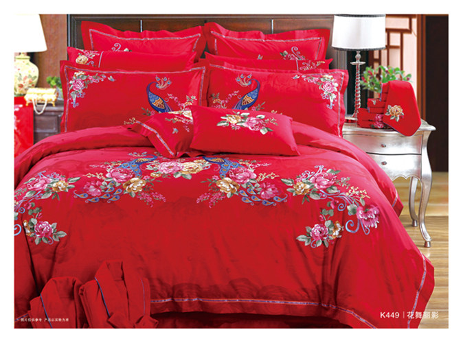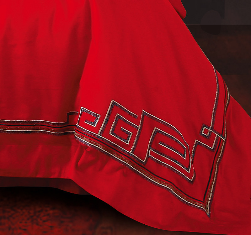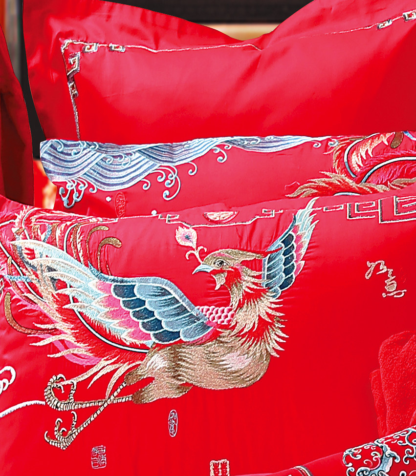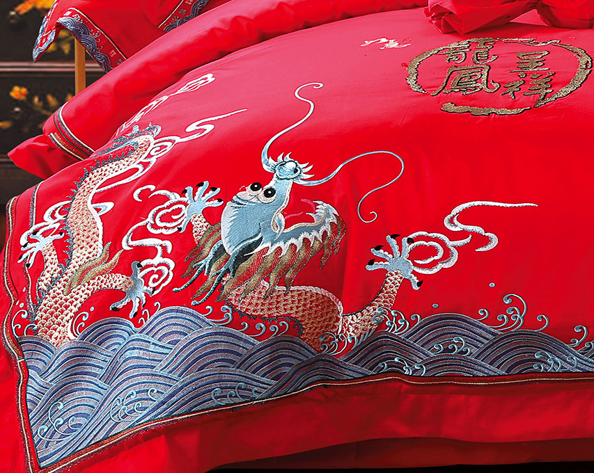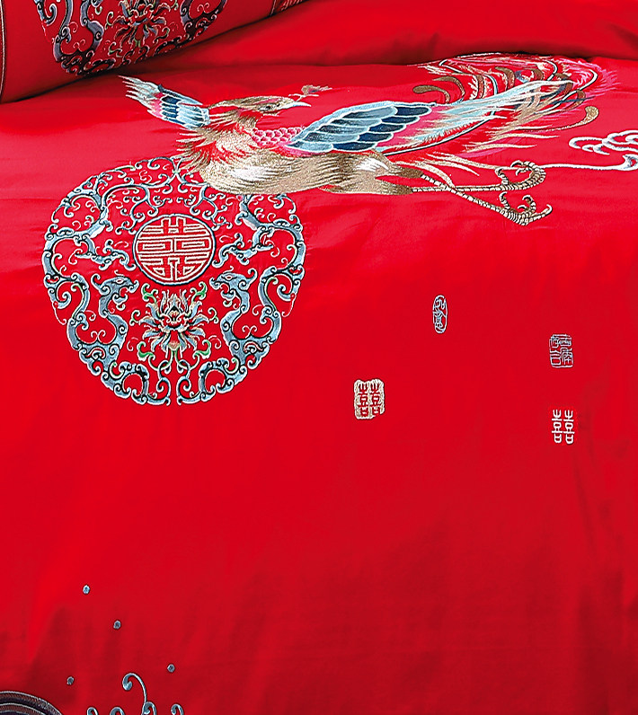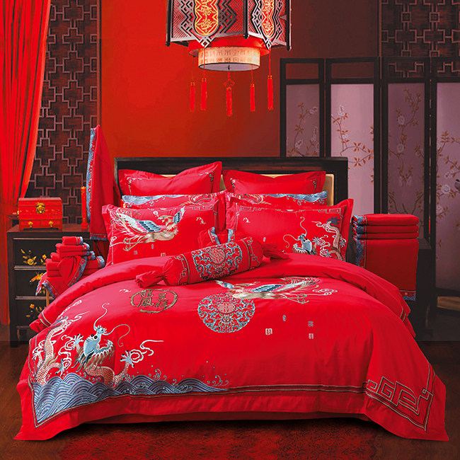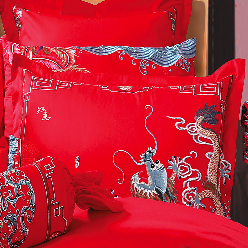 Покрывало, красный хлопковый комплект, постельные принадлежности, 4 предмета, с вышивкой, дракон и феникс