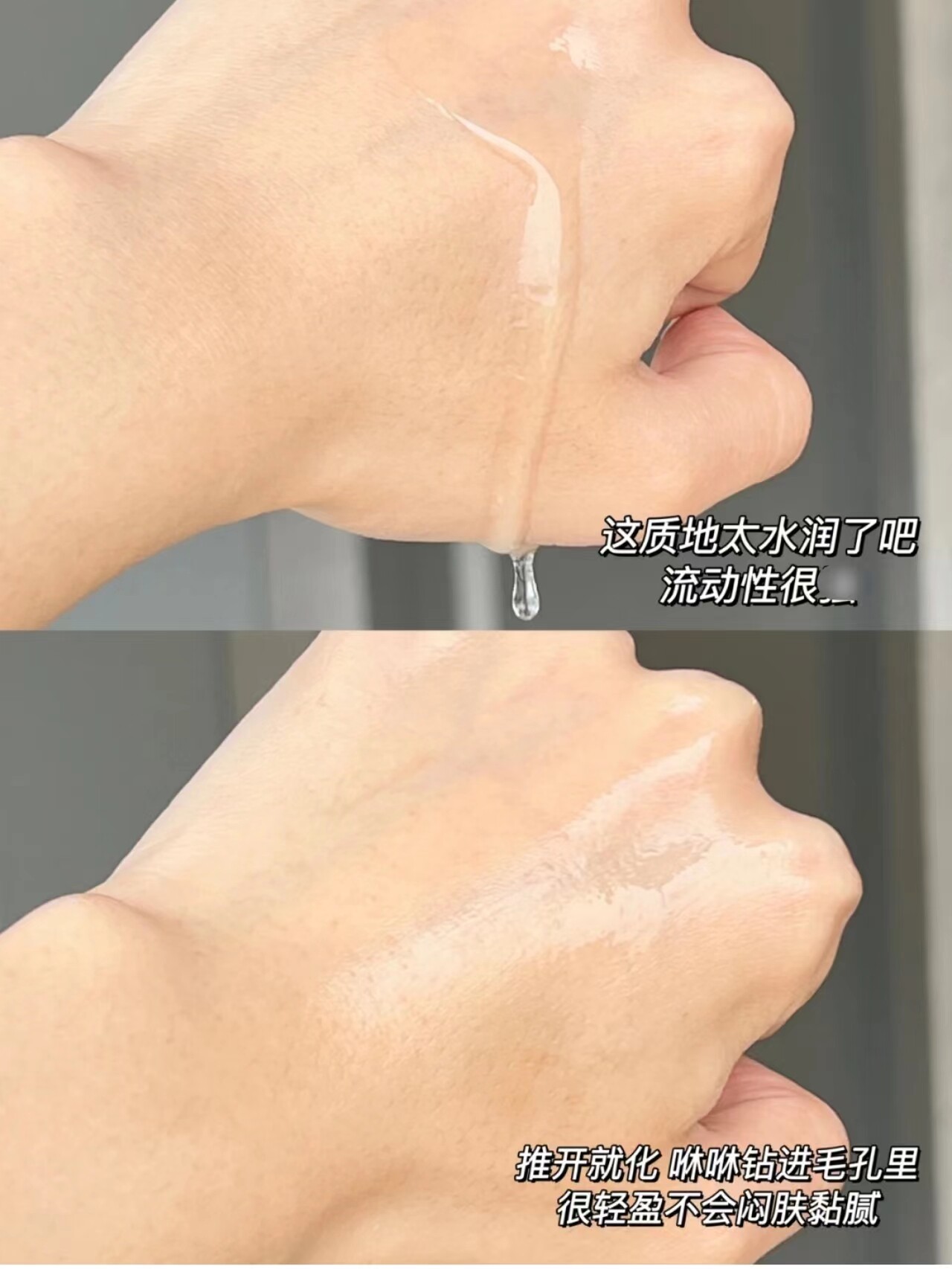 Водянистая текстура, жидкая, легкая и легко впитывается.
