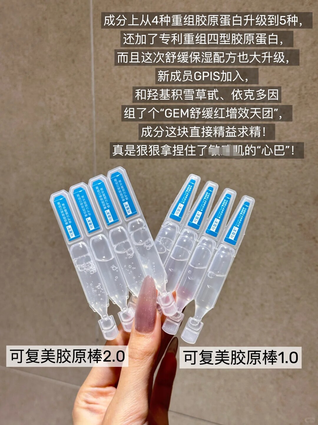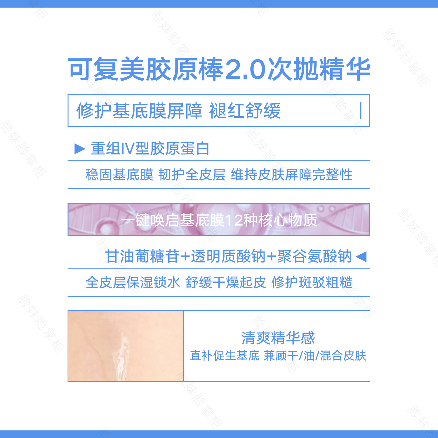| Компонент контраст | Четыре типа реструктуризации коллагена Эктоин, центелла азиатская 5D гиалуроновая кислота | 5 типов рекомбинантного коллагена Эктоин, центелла азиатская 5D гиалуроновая кислота, глицерил глюкозид |