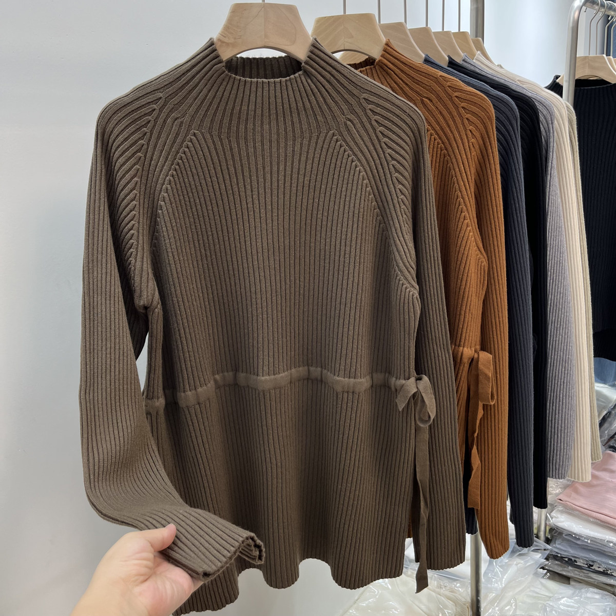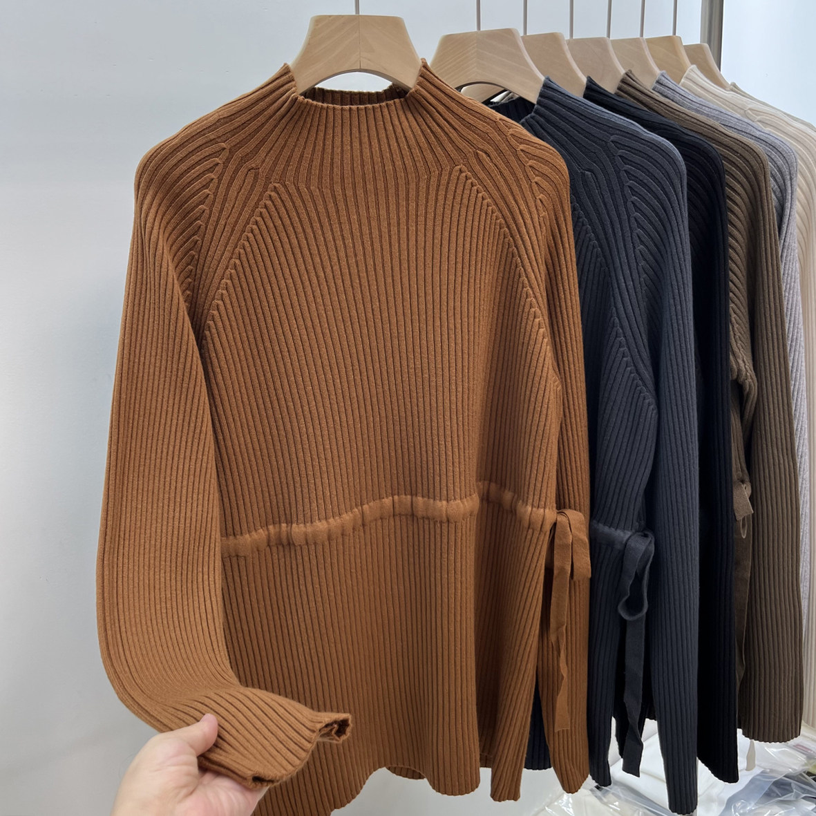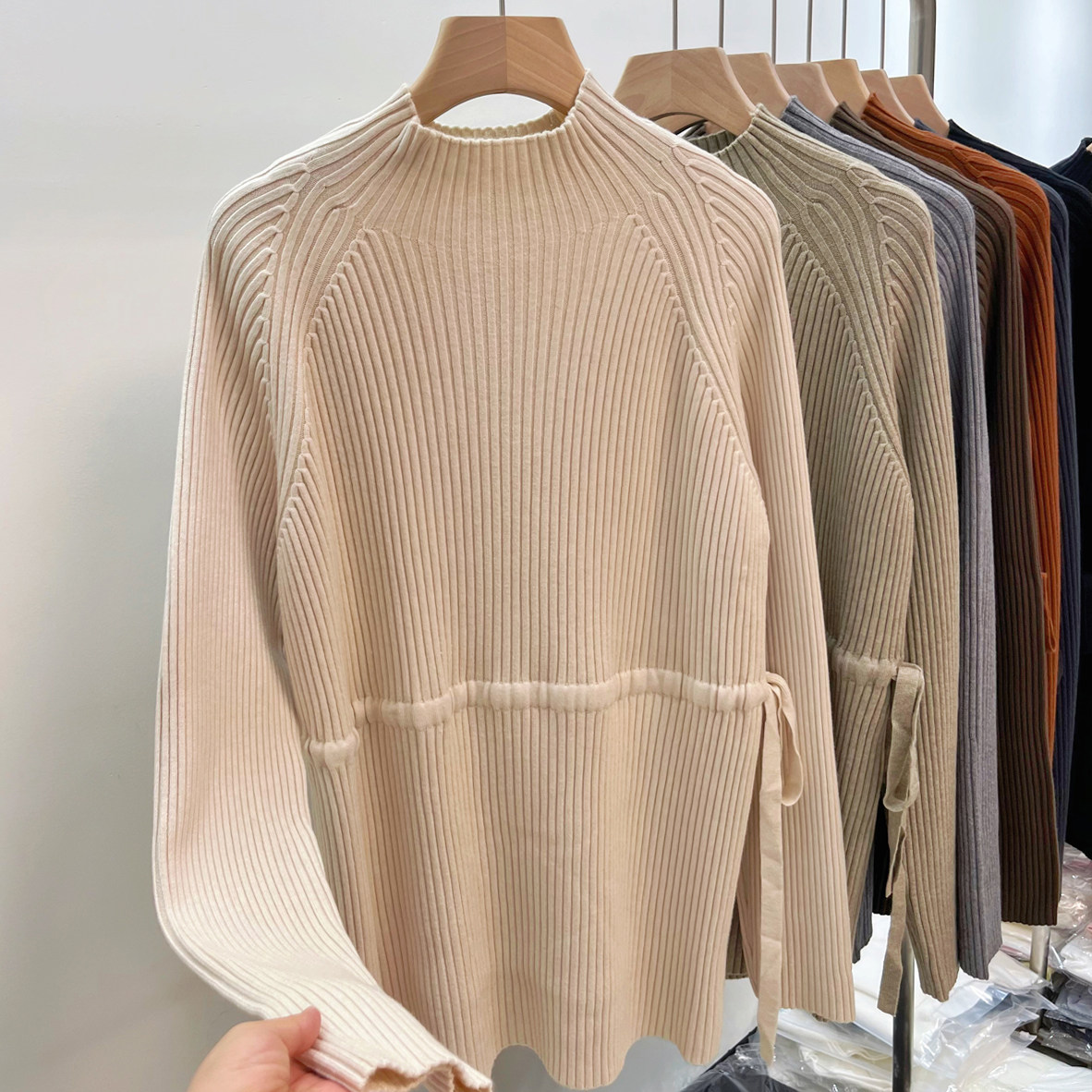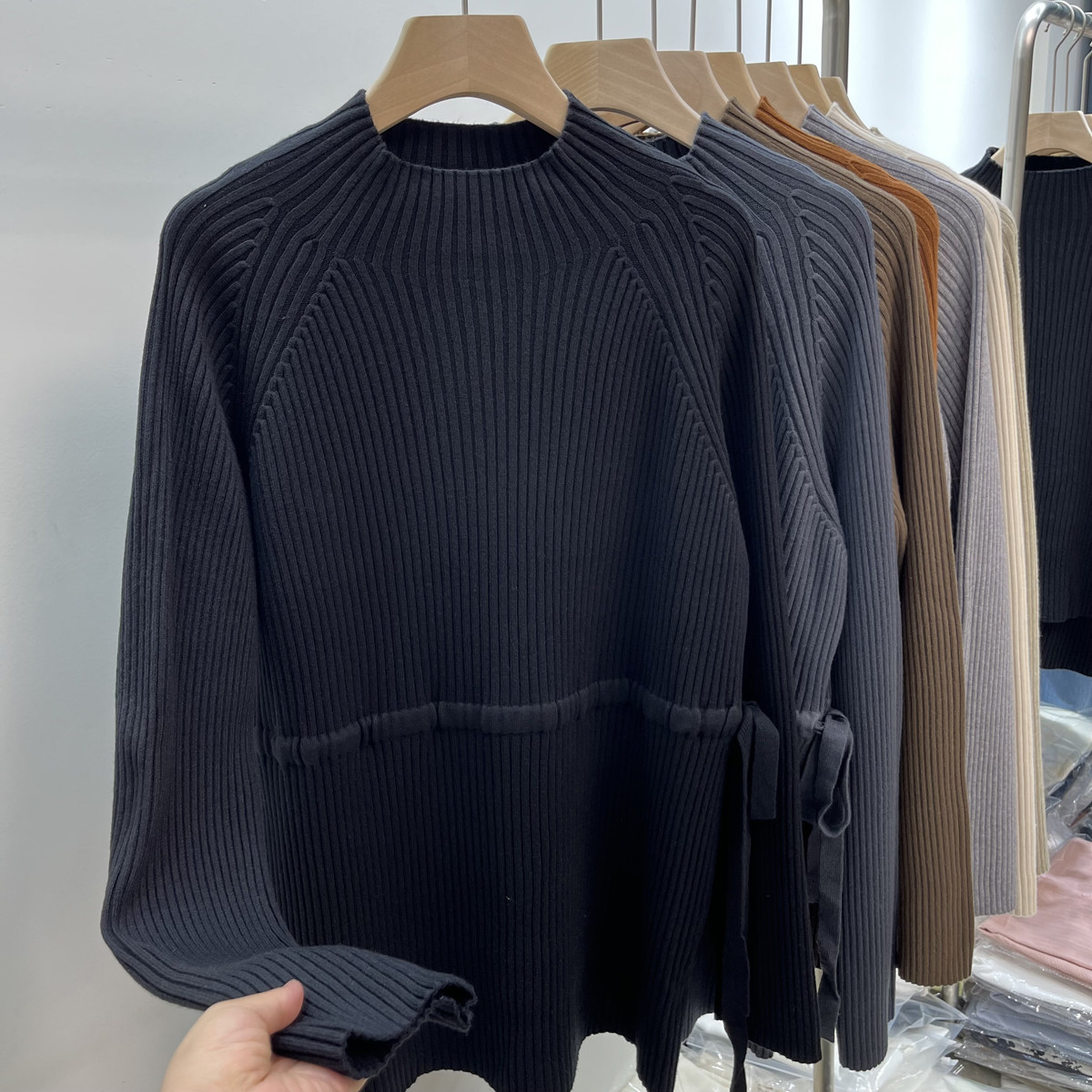 Демисезонный базовый свитер, приятные телу джинсы с начесом, длинный ремень, трикотажный корсет, высокий воротник, средней длины
