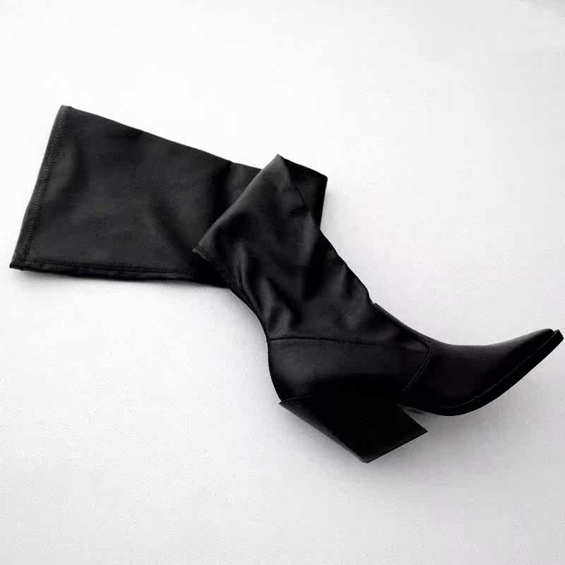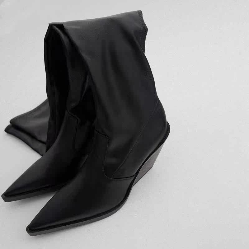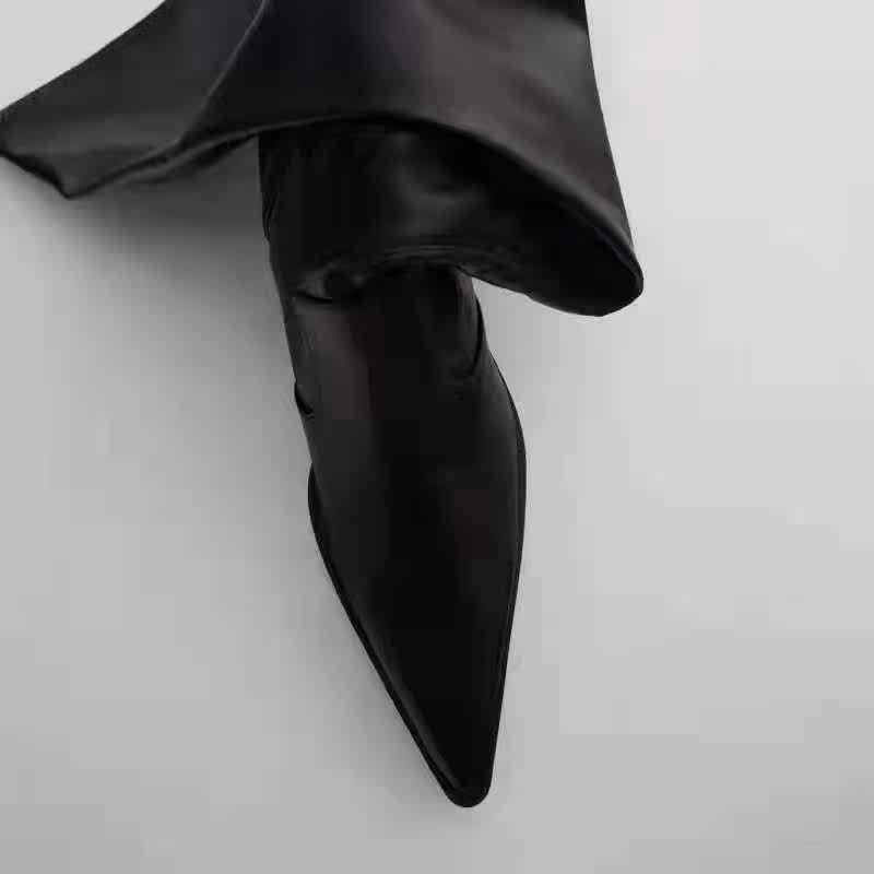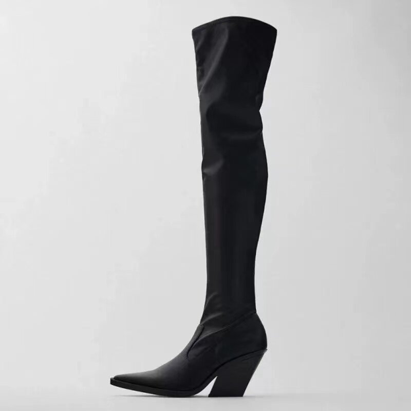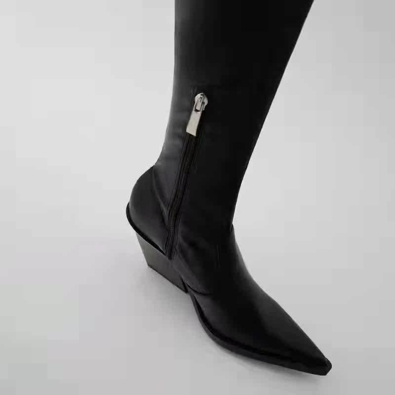 Испания, осень 2022, ковбойские сапоги ZA, длинные черные эластичные носки выше колена на толстом и высоком каблуке с острым носком