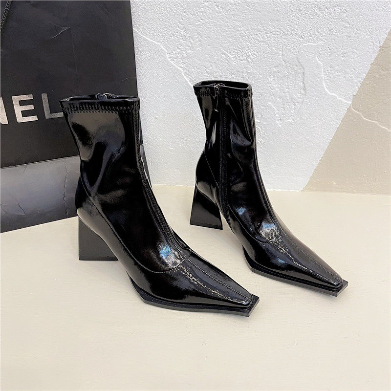 Популярная в этом году женская обувь из лакированной кожи. 2022 новые короткие сапоги. Женские короткие сапоги с острым носком на высоком каблуке. Эластичные тонкие сапоги. Женские сапоги на толстом каблуке.
