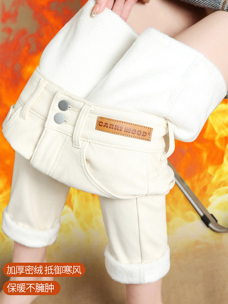 Длинные демисезонные джинсы, утепленные штаны, бежевые леггинсы, высокая талия, для формы тела «груша»