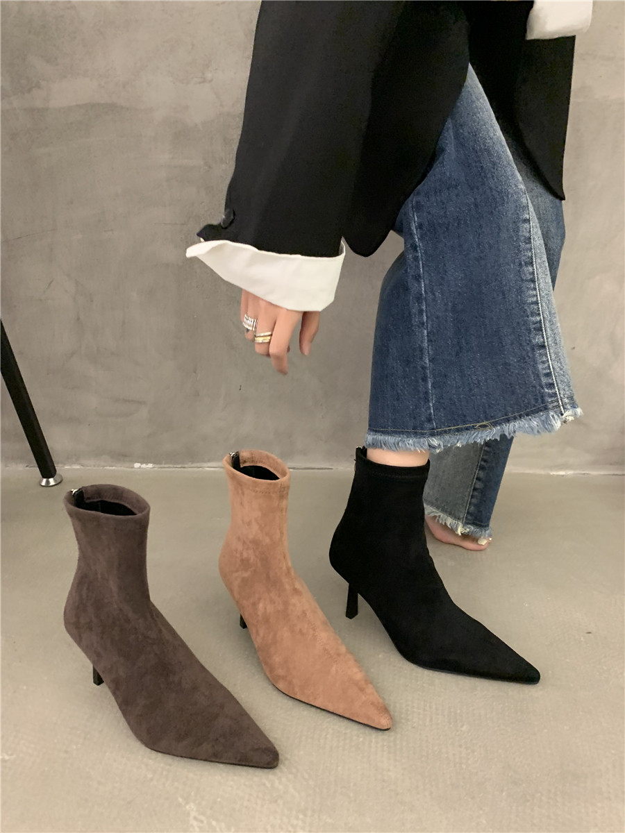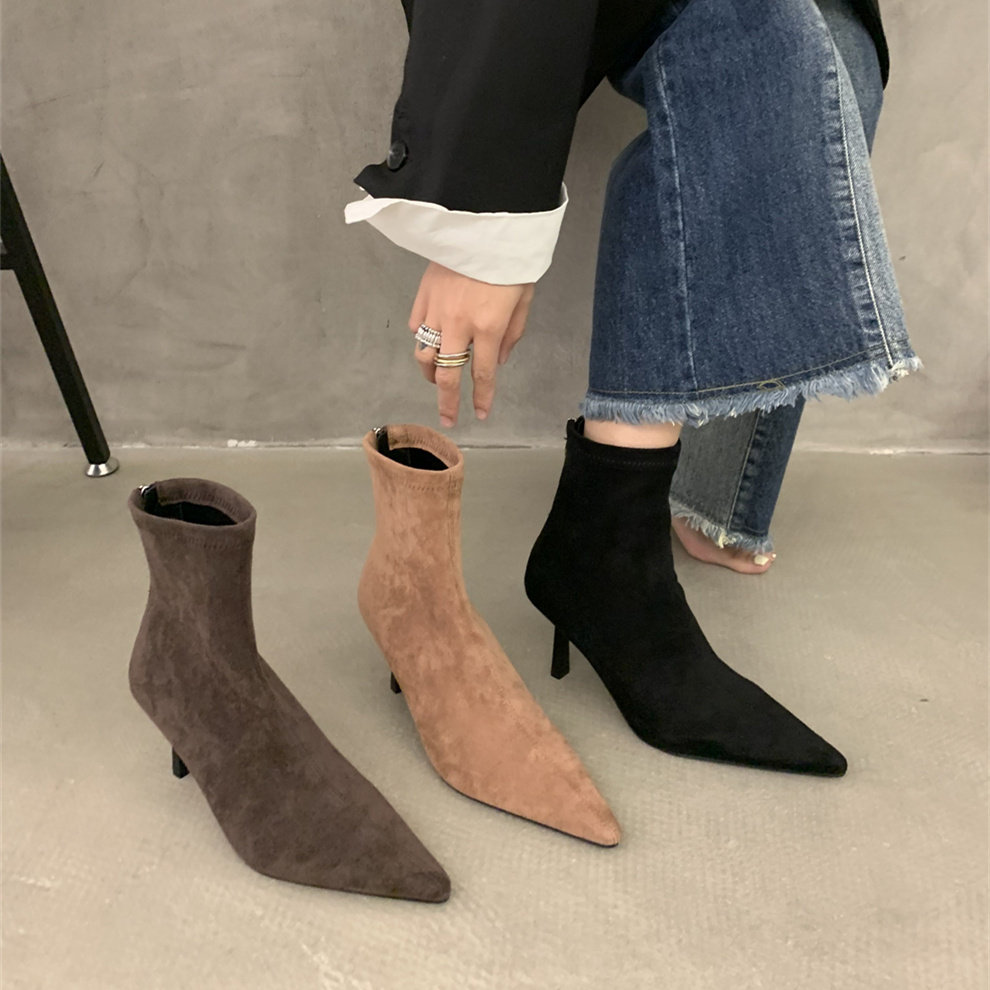 Модная ретро подходит с юбкой на высоком каблуке, демисезонные короткие сапоги с заостренным носом, ботинки, французский стиль