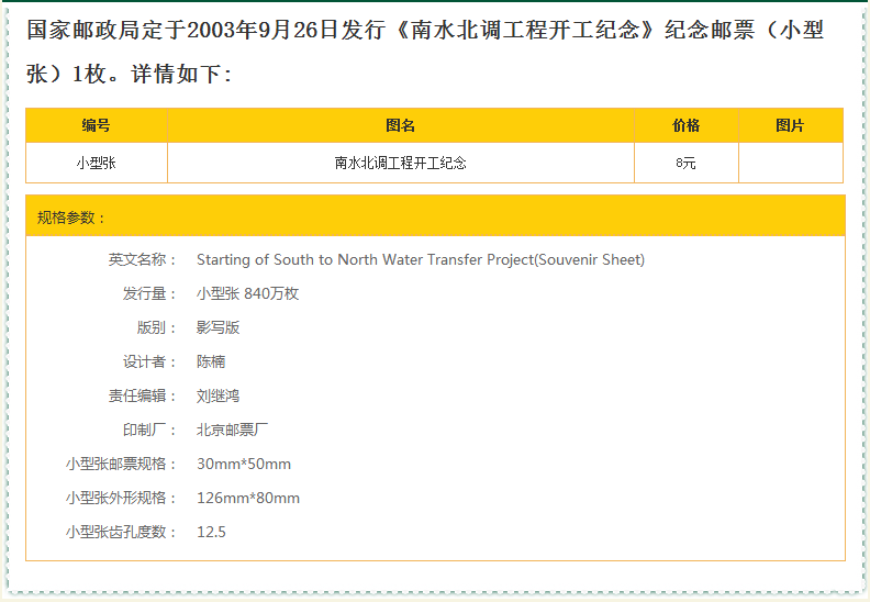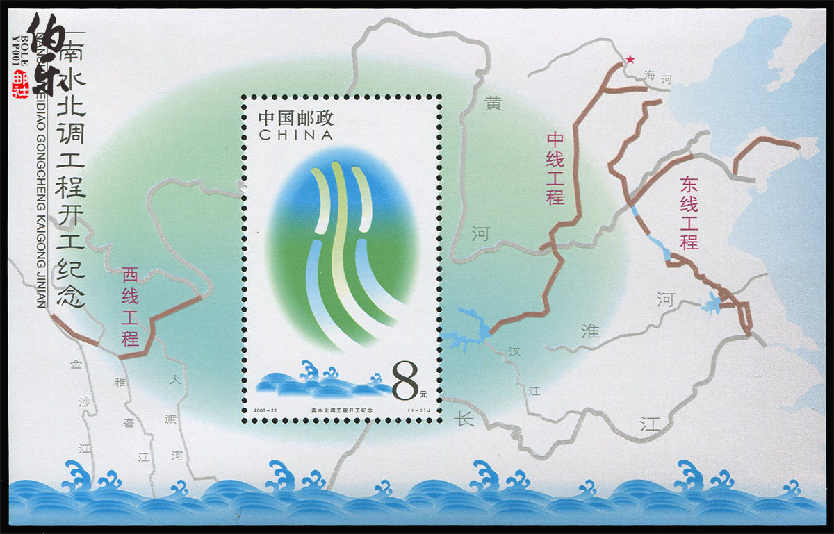 "  South-North Water Distry Distry Project Project "Печать"-это небольшой лист, основной картиной марки является сценарий пиктографического уплотнения&Ldquo; вода&Rdquo;, умно соответствует маршрутам диверсии воды от диверсии воды с юго-север&Ldquo; Тайная связь” и направление потока воды показано с помощью метода цветового градиента.Основная диаграмма небольшого листа представляет собой схематическую диаграмму маршрута диверсии воды на востоке, среднем и западном проекте проекта диверсии воды с юго-север. Нижняя часть небольшого листа оснащена классическими схемами воды.
