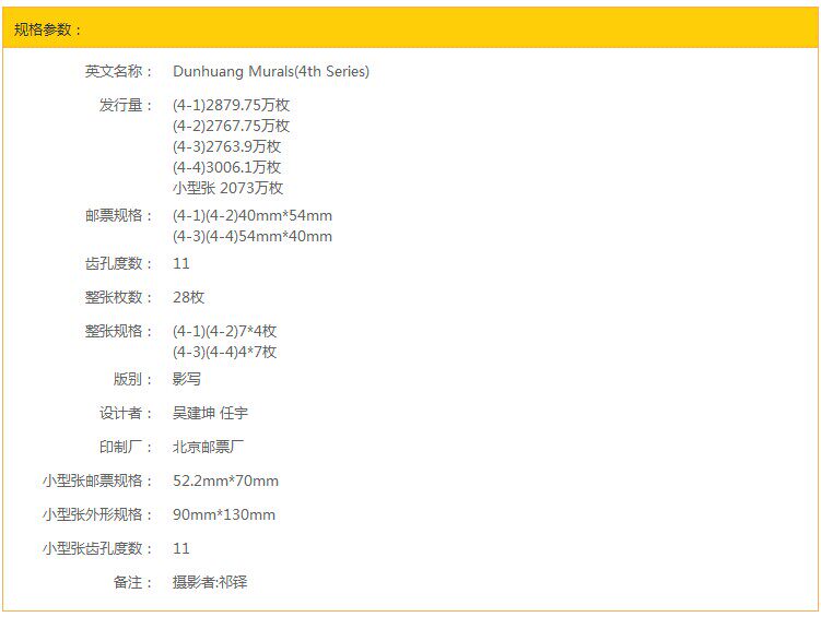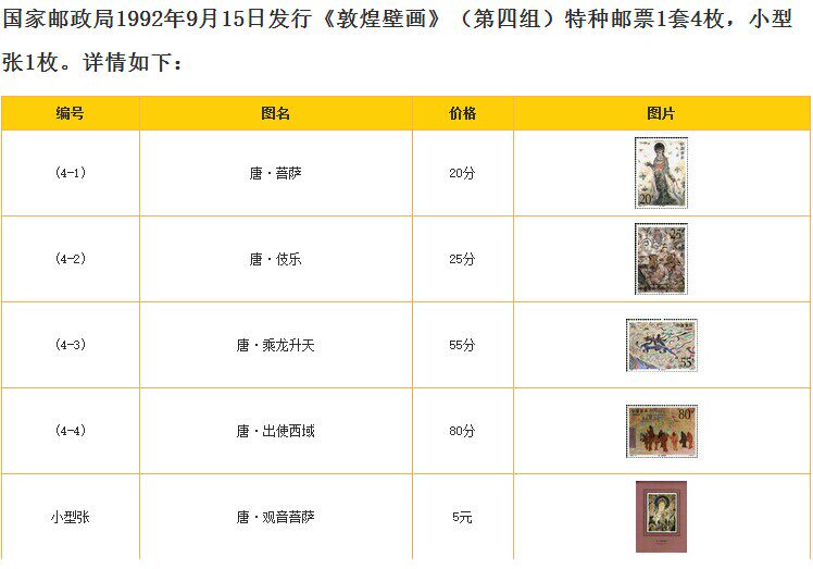 Этот набор марок выбран из ранних росписных работ династии Тан в могао -гротах в Дунхуанге.Первая картина [Tang]&Миддот; Бодхисаттва], статуя Бодхисаттвы на картине создает добрую, нежную, тихую и очаровательную женскую красоту.Картинка 2 [Тан&Миддот; Музыка], картина - северная стена пещеры.“ Чистое изменение земли восточного фармацевта&Группа групп в RDQUO; Картинка 3 [Тан&Миддот;Вознестись на небеса Драконом], картина - это вспомогательная роль всей росписи, которая показывает сцену бессмертного езды на драконе, ведущей путь на небеса как бодхисаттва на слоне. Картинка 4 [Тан&Миддот;Чтобы пойти в западные регионы], у оригинальной картины есть три сцены. Эта картина выбирает часть второй сцены. Человек, едущий на лошади, - это император Ву из Хана, а остальные - министры и служители.Маленький Чжан Вэй [Танг&Миддот; Гуаньян Бодхисаттва].