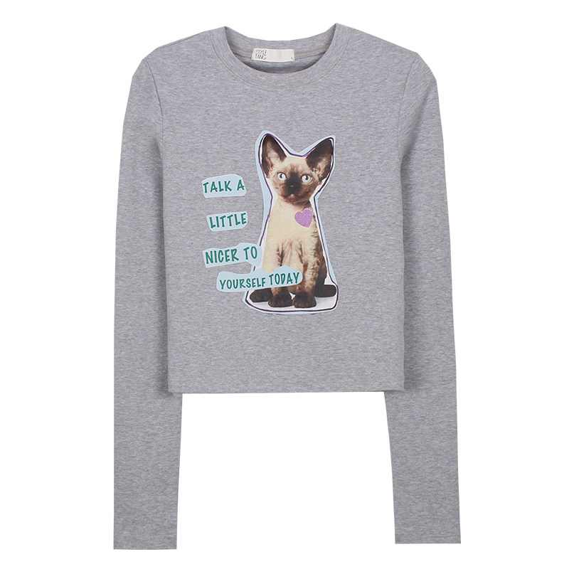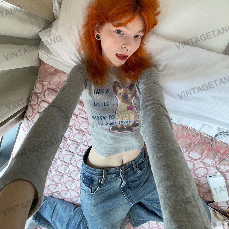 Vintagetang American Hot Girl Gorce Grey Cat Printed Short Slim Long Dlover Top Casual T -Fork Jiyi D