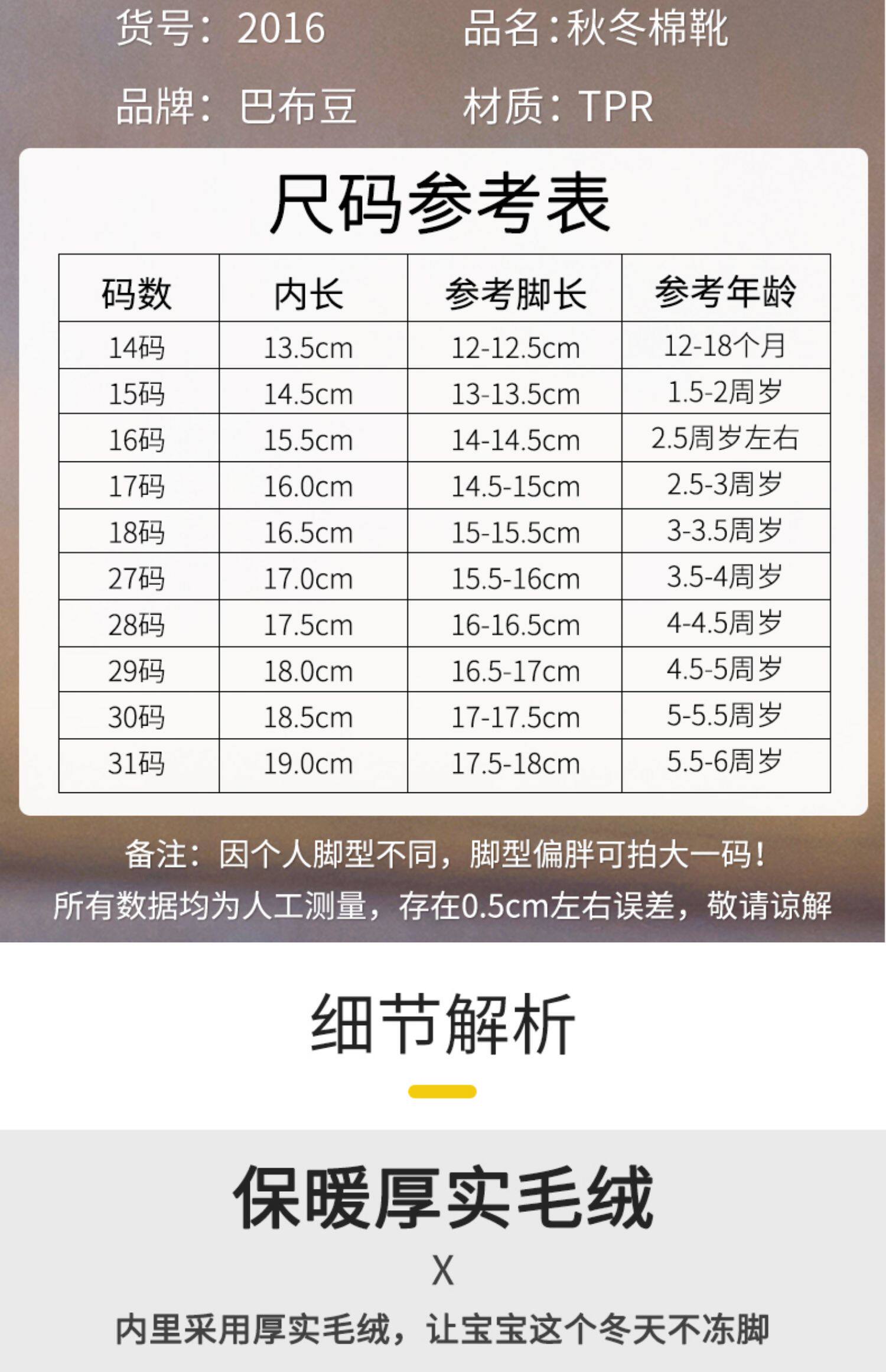 | Размер обуви: | Стоя и проверка длины обнаженной ноги+1 см. Выбор обуви, Foot Fat и хотите купить Big Plus от 1 до 1,5 см, чтобы выбрать внутреннюю обувь обуви, 14см, 14.5см, 15см, 16см, 17см, 17.5см, 18см, 18.5см, 19см, 19.5см |
