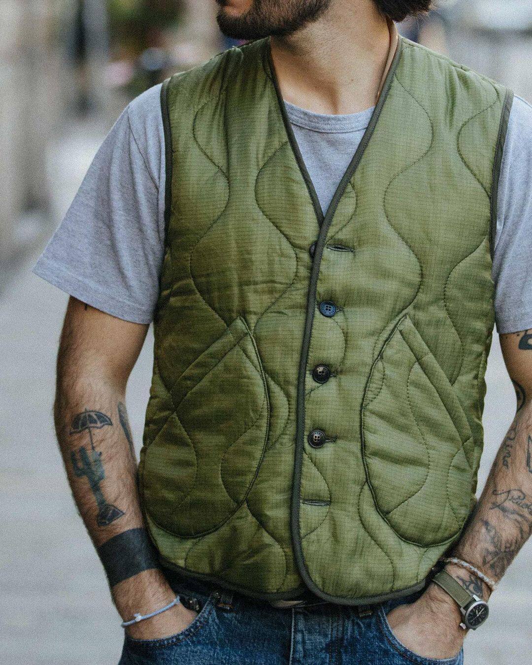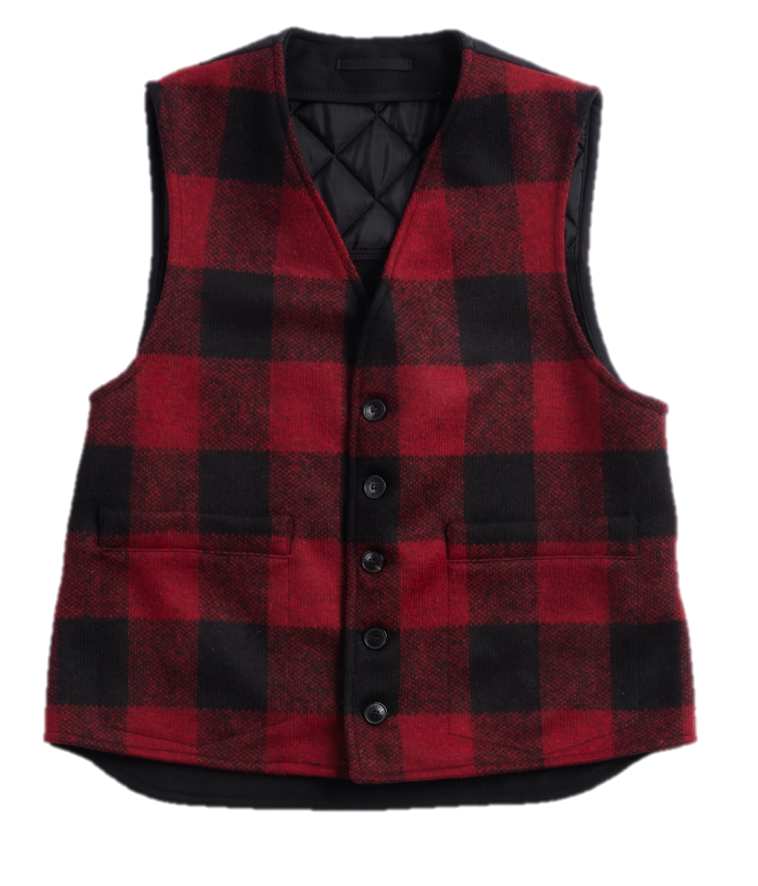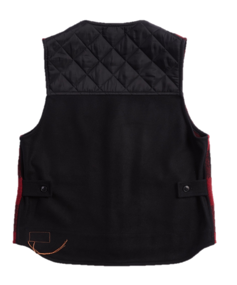 Вдохновленный рабочей одеждой жилет с шерстью от Manteco спереди и сзади в простой шерстяной одежде с успокаиваемым иом. Неосказанные, карманы, маленькие переключатели на нижней части спины. Кнопки логотипа с четырьмя отверстиями.