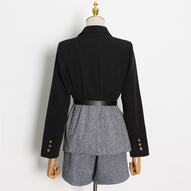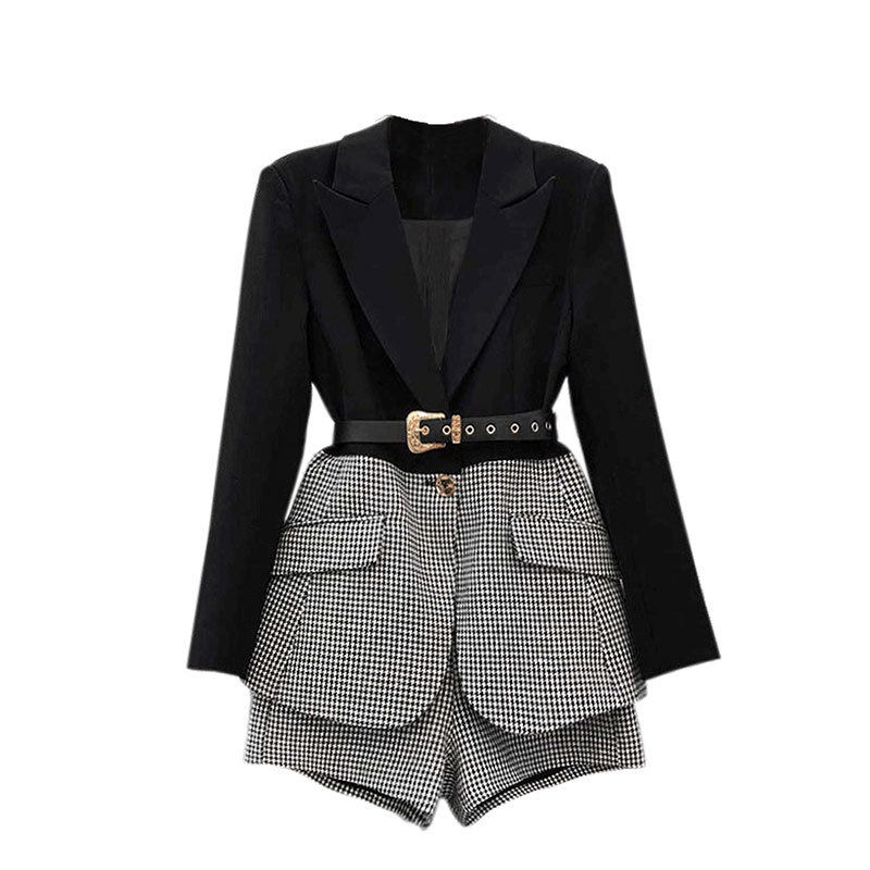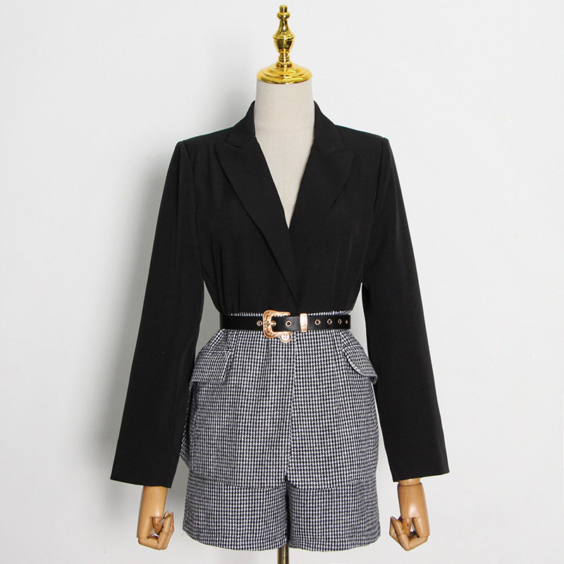 Осенний лонгслив, ремень, дизайнерский корсет, пиджак классического кроя, шорты, комплект, европейский стиль, средняя посадка