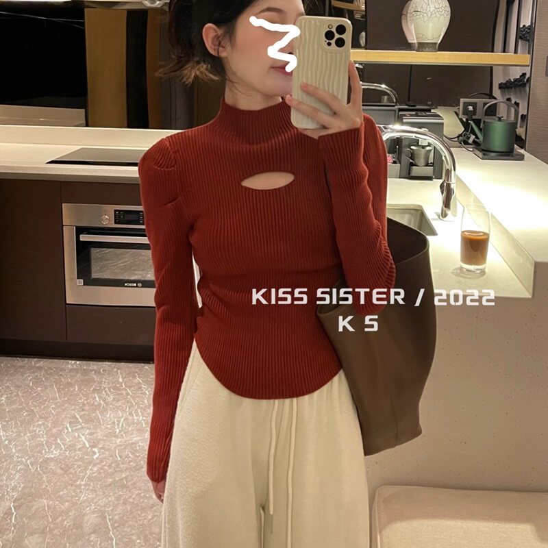 Свитер, трикотажный лонгслив, в корейском стиле, рукава фонарики, высокий воротник, 2022