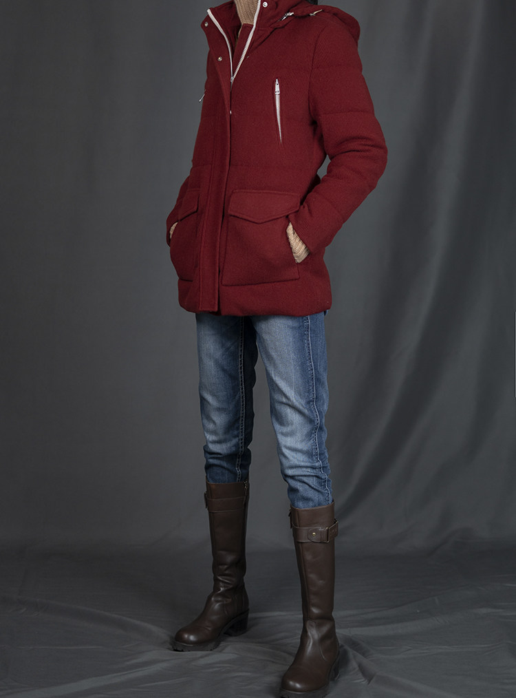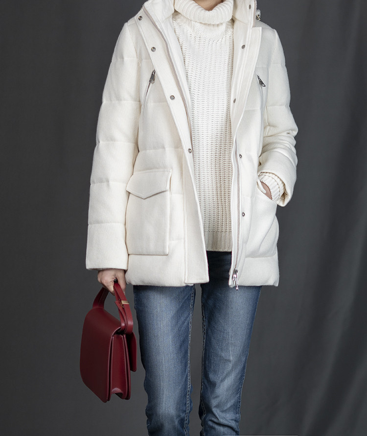 Толщина: подкладка из одинарной пряжи кашемира + наполнитель из белого гусиного пуха + наружный слой из однобортного бархатного игольчатого кашемира с четырьмя плоскими иглами.