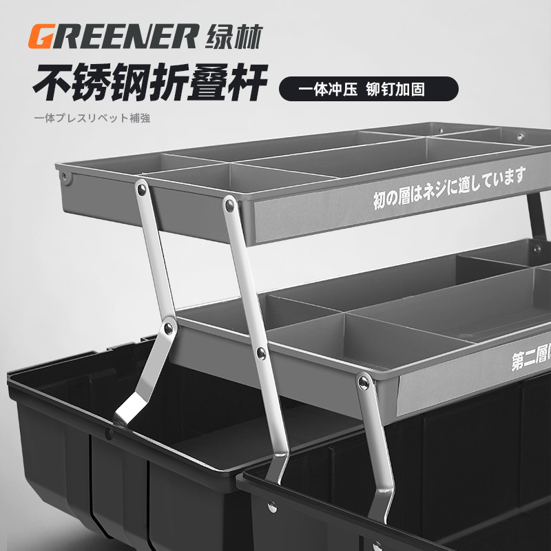 Зеленая лесная пластиковая ящик для инструментов, предоставляя многофункциональную аппаратную аппаратную индустриальную художественную искусство, символизирующие электрическую лабораторию автомобиля, электрическая лаборатория