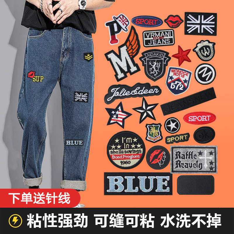W -Jeans Patching Sticker Men's Cave Seam Сампсинизация Маркировка Женская банка сшита вышивки и субсидийная ткань Дополнительный пещерный артефакт