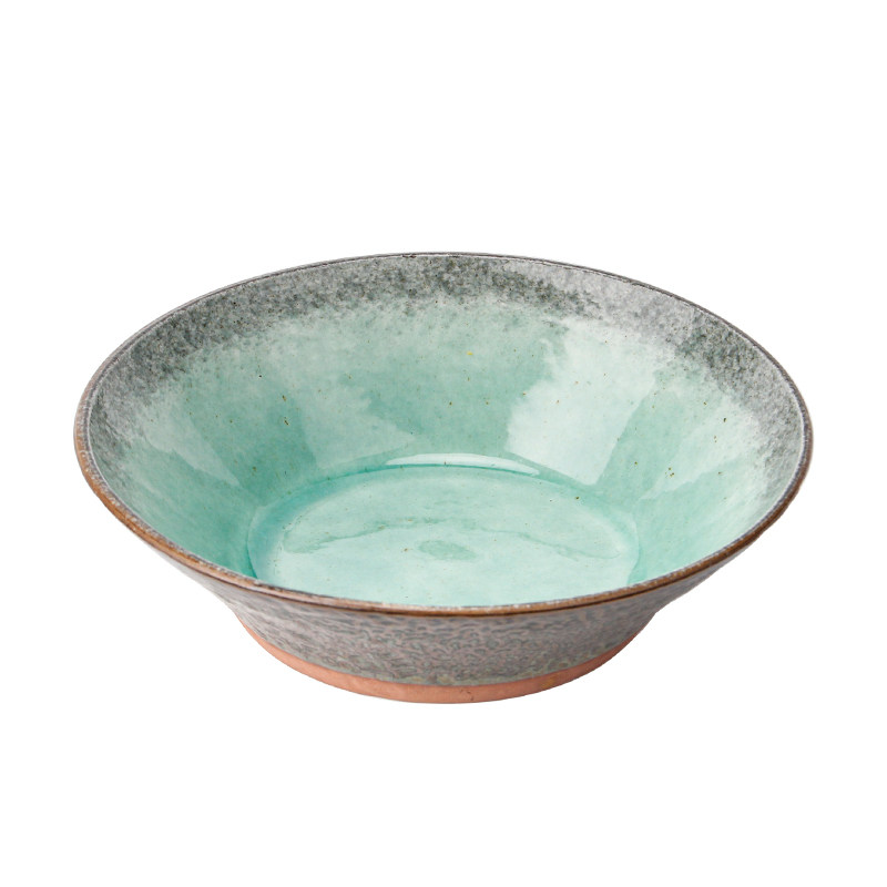 Зеленая печь в японском стиле становится густой гонт -глиняной круглой глазурью под красочной салат -миской с лапшой, чаша для завтрака, дневной чай сладкий продукт