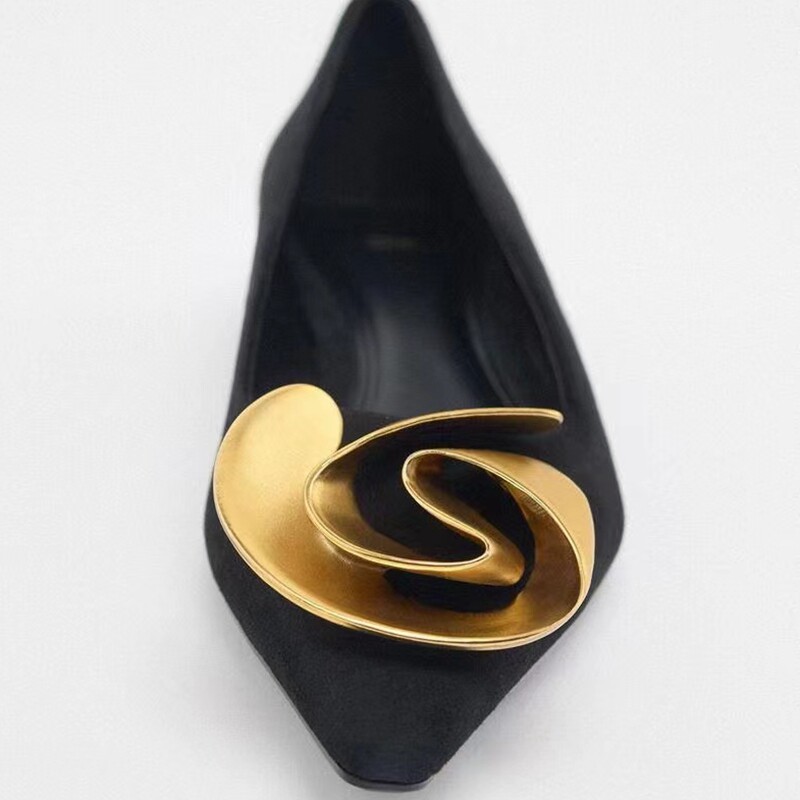 Весенняя новинка 2023 года в Испании, черные туфли с острым носком и неглубоким ртом, металлические балетки с цветком из овечьей замши