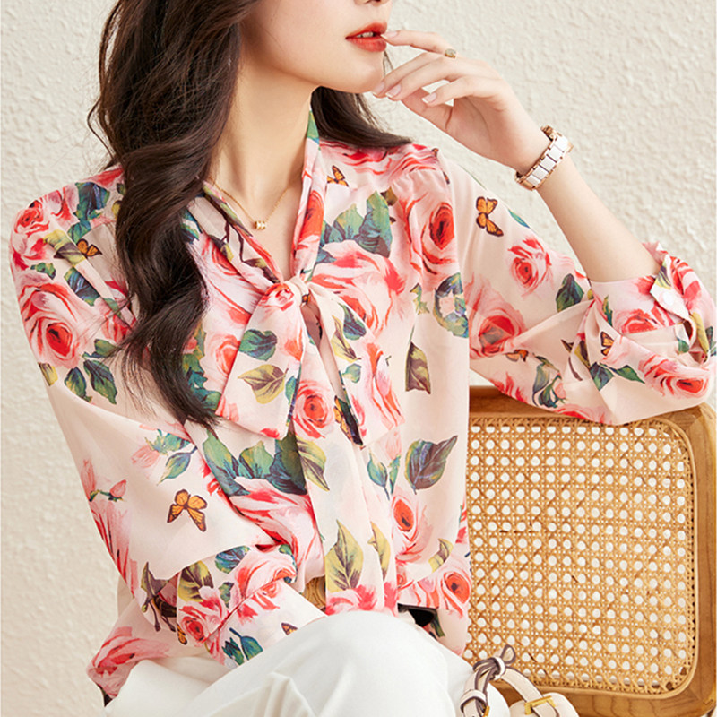 Рубашка, весенний шифоновый лонгслив с бантиком, коллекция 2023