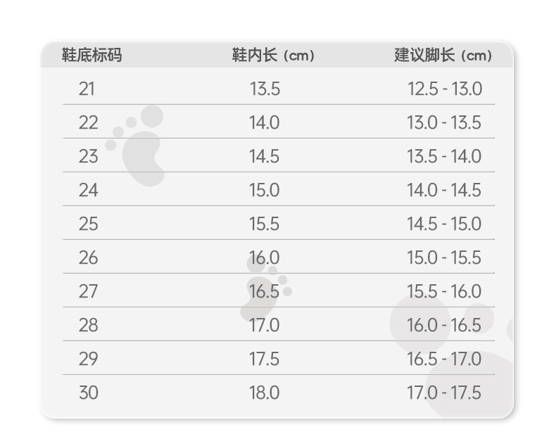 | Размер обуви: | Внутренняя длина 13,5 см, размер 21/подходит на ногу 12,5-13 см., Внутренняя длина 14 см, размер 22/подходит на ногу 13-13,5 см., Внутренняя длина 14,5 см, размер 23/подходит на ногу 13,5-14 см., Внутренняя длина 15 см 24 размера/подходит для длины ног 14C-14,5M, Внутренняя длина 15,5 см, размер 25/подходит на ногу 14,5-15 см., Внутренняя длина 16 см, размер 26/подходит на ногу 15-15,5 см., Внутренняя длина 16,5 см, размер 27/подходит на ногу 15,5-16 см., Внутренняя длина 17 см, размер 28/подходит на ногу 16-16,5 см., Внутренняя длина 17,5 см, размер 29/подходит на ногу 16,5-17 см., Внутренняя длина 18 см, размер 30/подходит на ногу 17-17,5 см. |