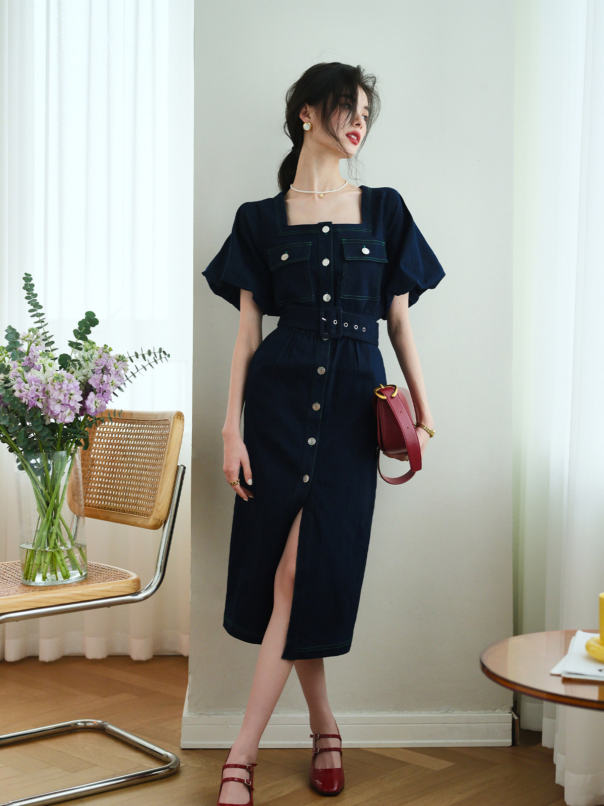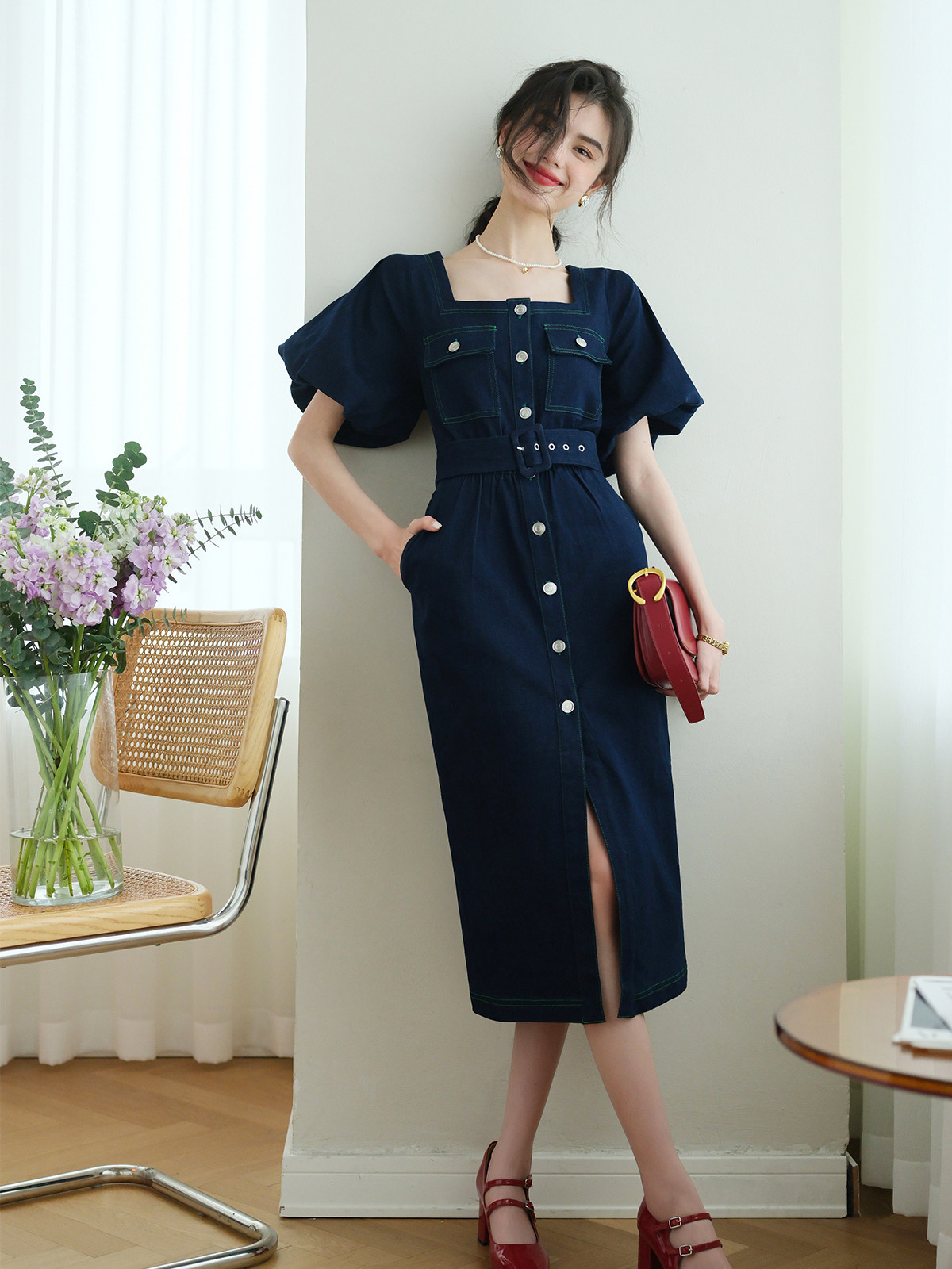 Ретро весеннее джинсовое платье, дизайнерская длинная юбка, французский стиль, квадратный вырез, 2023, тренд сезона, яркий броский стиль, средней длины