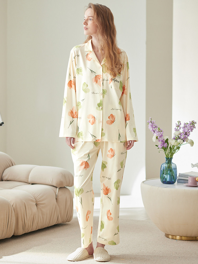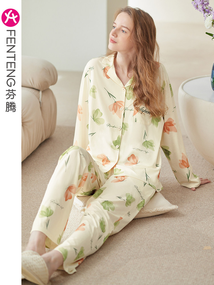 芬腾 Осенняя пижама, хлопковый милый лонгслив, кардиган, хлопковая рубашка, комплект, большой размер