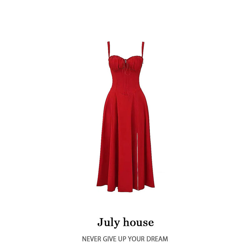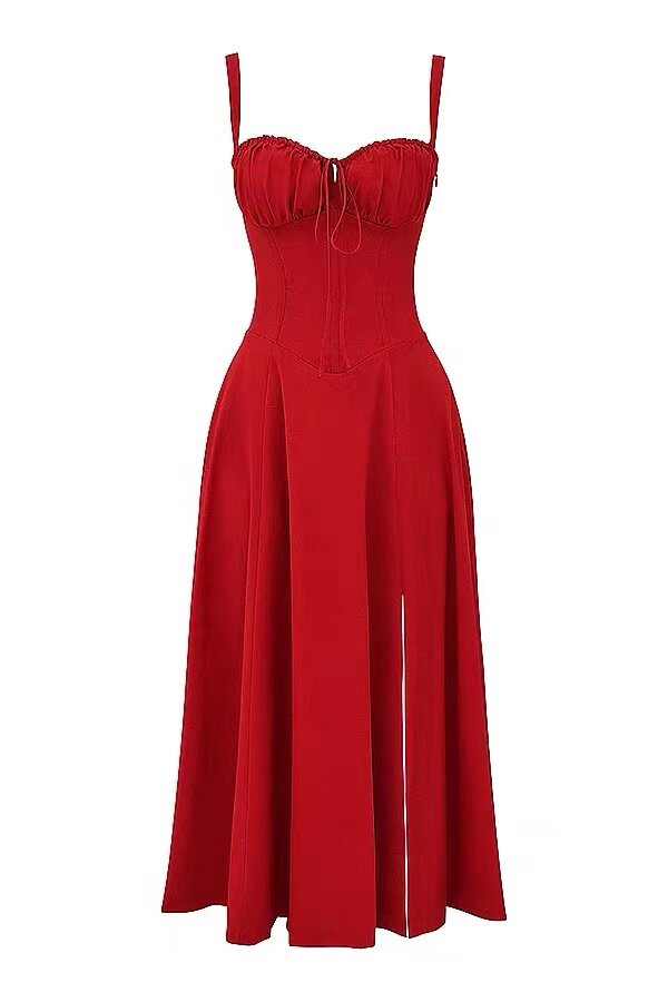 Летнее красное ретро платье, корсет, ремень, французский стиль