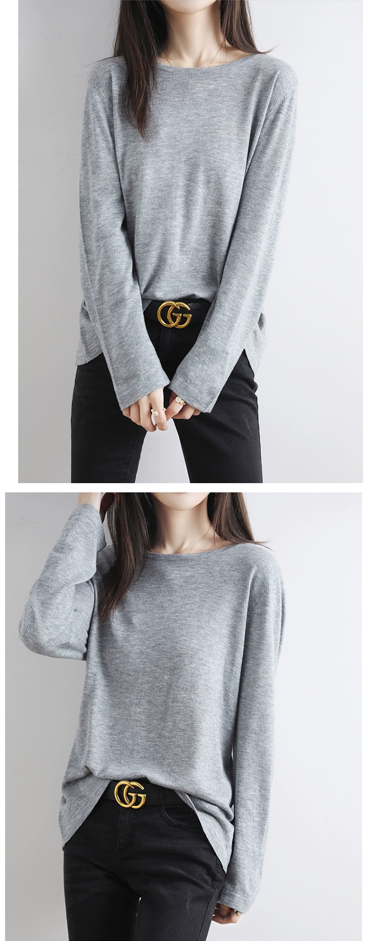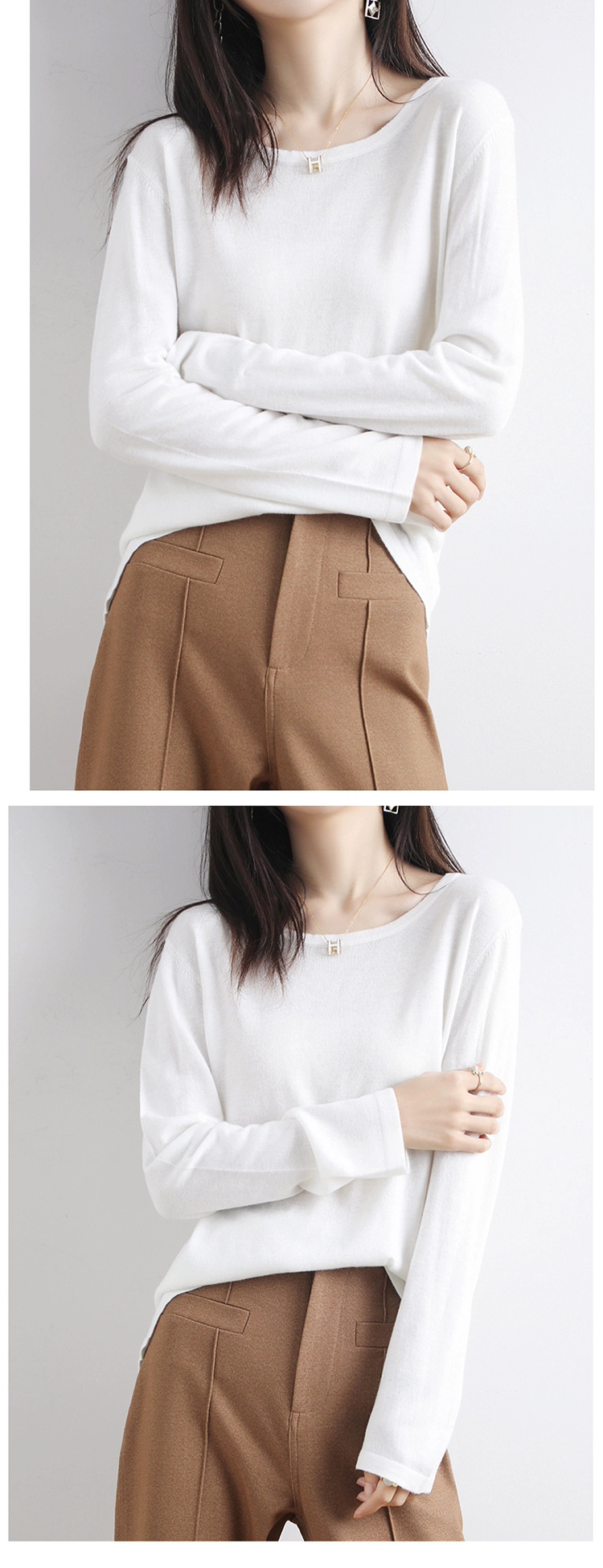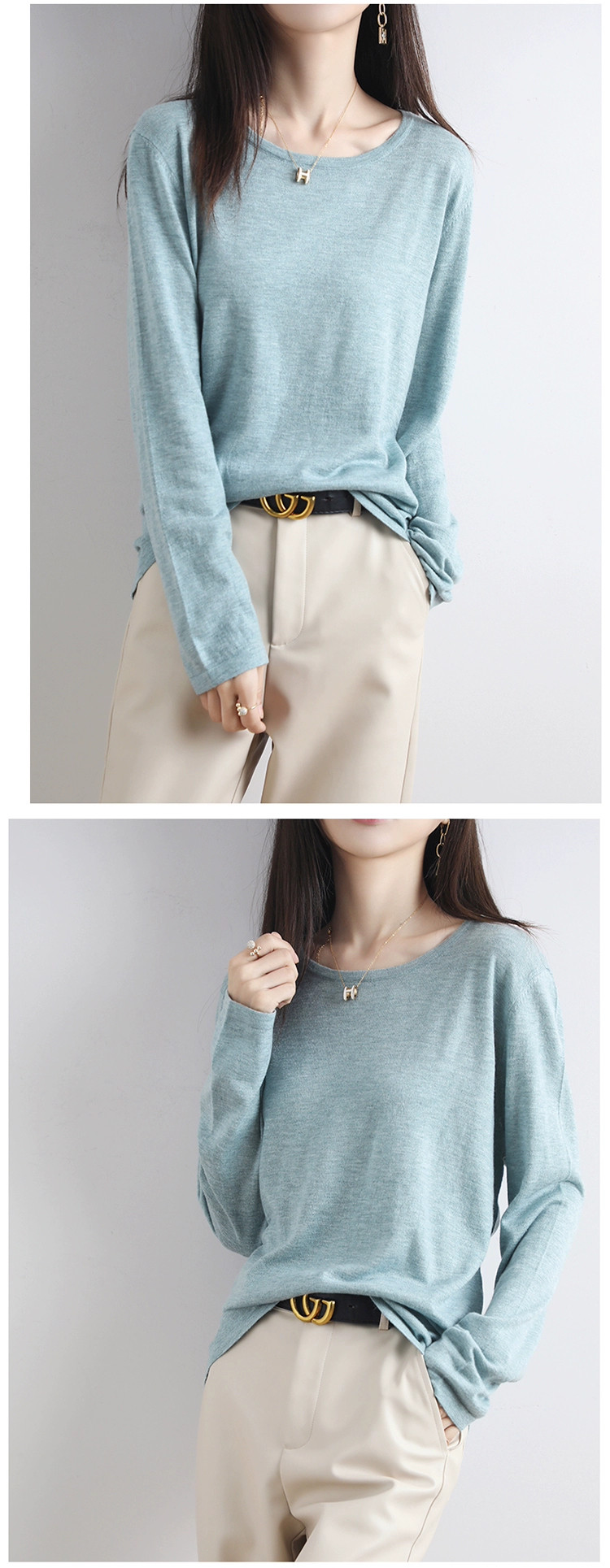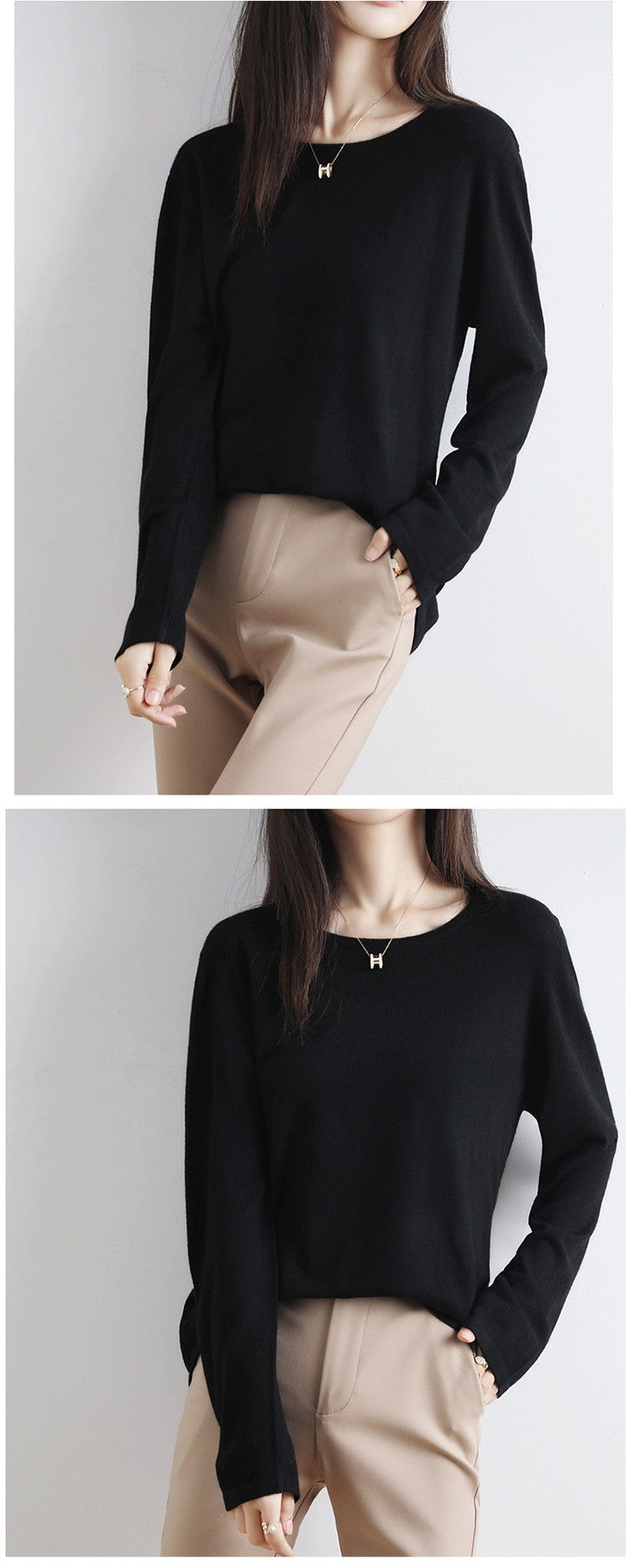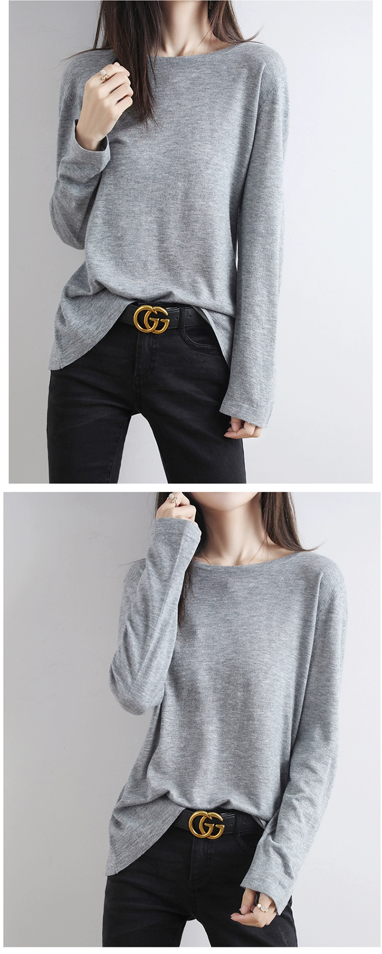 Шерстяной тонкий кашемировый базовый приятный телу свитер с круглым воротником, свободный крой