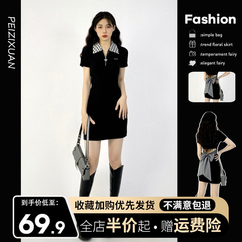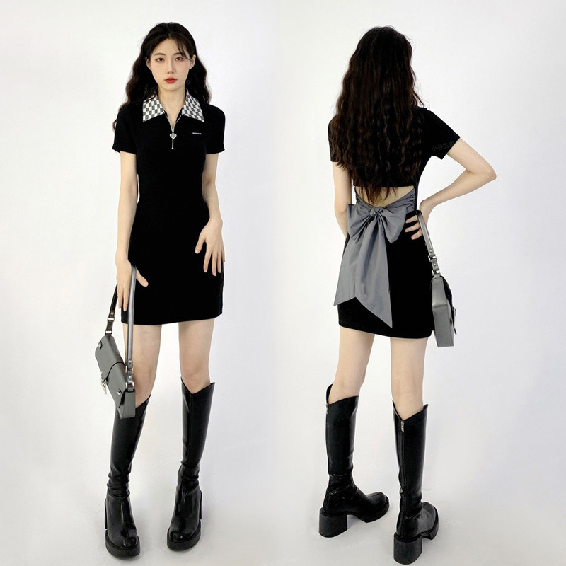 Черные шахматы, летнее платье, приталенный корсет, поясная сумка, изысканный стиль, с акцентом на бедрах